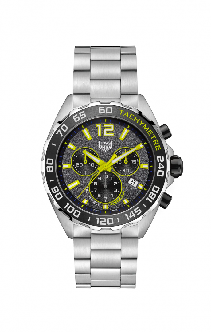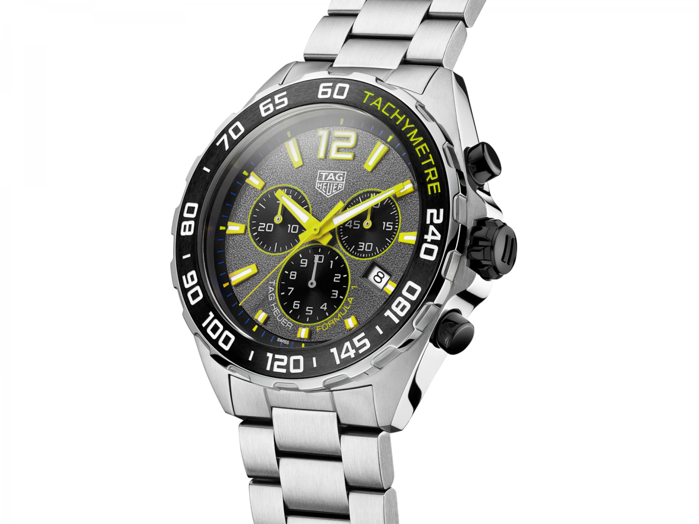 TAG Heuer Formula 1 . Die Uhr hat folgende Funktionen: Lumineszenz, Stoppuhr, Tachymeter-Skala und Datum . Die Grundparameter der Uhr sind: bewegungsart ist Quarz-Chronograph, wasserabweisend ist 200 m, armbandmaterial ist Stahl und ziffernblattfarbe ist gelb und grau.