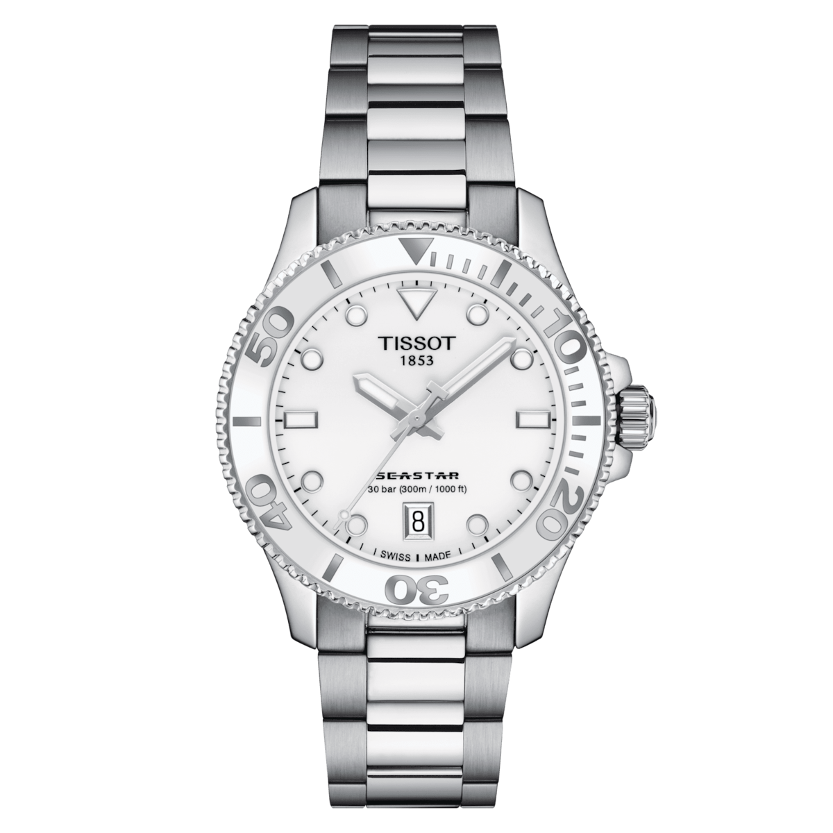 Tissot SEASTAR 1000 36mm Stahlgehäuse mit Stahlschließe. Die Uhr hat folgende Funktionen: Datum und Lumineszenz. Die Grundparameter der Uhr sind: armbandmaterial ist stahl, bewegungsart ist Quarzuhren, wasserabweisend ist 300 m und ziffernblattfarbe ist weiß.
