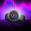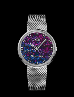 A Commander 1959 új változatának számlapján színes pixeleket utánzó grafikai elemeket találunk, amelyek egyszerre idézik meg korunk digitális lendületét és az óragyártás hagyományos értékeit. A fekete alapon figyelemfelkeltő kék, lila és rózsaszín képpontok játékos kompozíciója egyedi karaktert kölcsönöz az órának. Az óra éjjel megelevenedik: a számlapon található Super-LumiNova® bevonat foszforeszkál, teljesen új arcot adva az órának és a retro diszkók hangulatát sugározza.