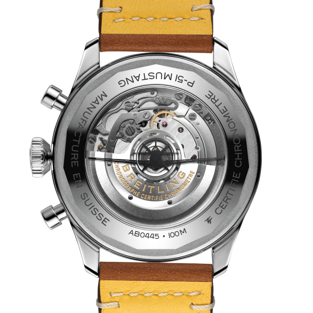 luxury watches Breitling SUPER AVI B04 CHRONOGRAPH GMT 46 P-51 MUSTANG In-house calibre, Water resistance 100M, 46 mm. The watch has functions dual time, luminescence, stopwatch and date . Basic parameters of the watch are: dial colour is black, movement type is mechanical chronograph with automatic winding, strap material is leather and water resistance is 100 m.