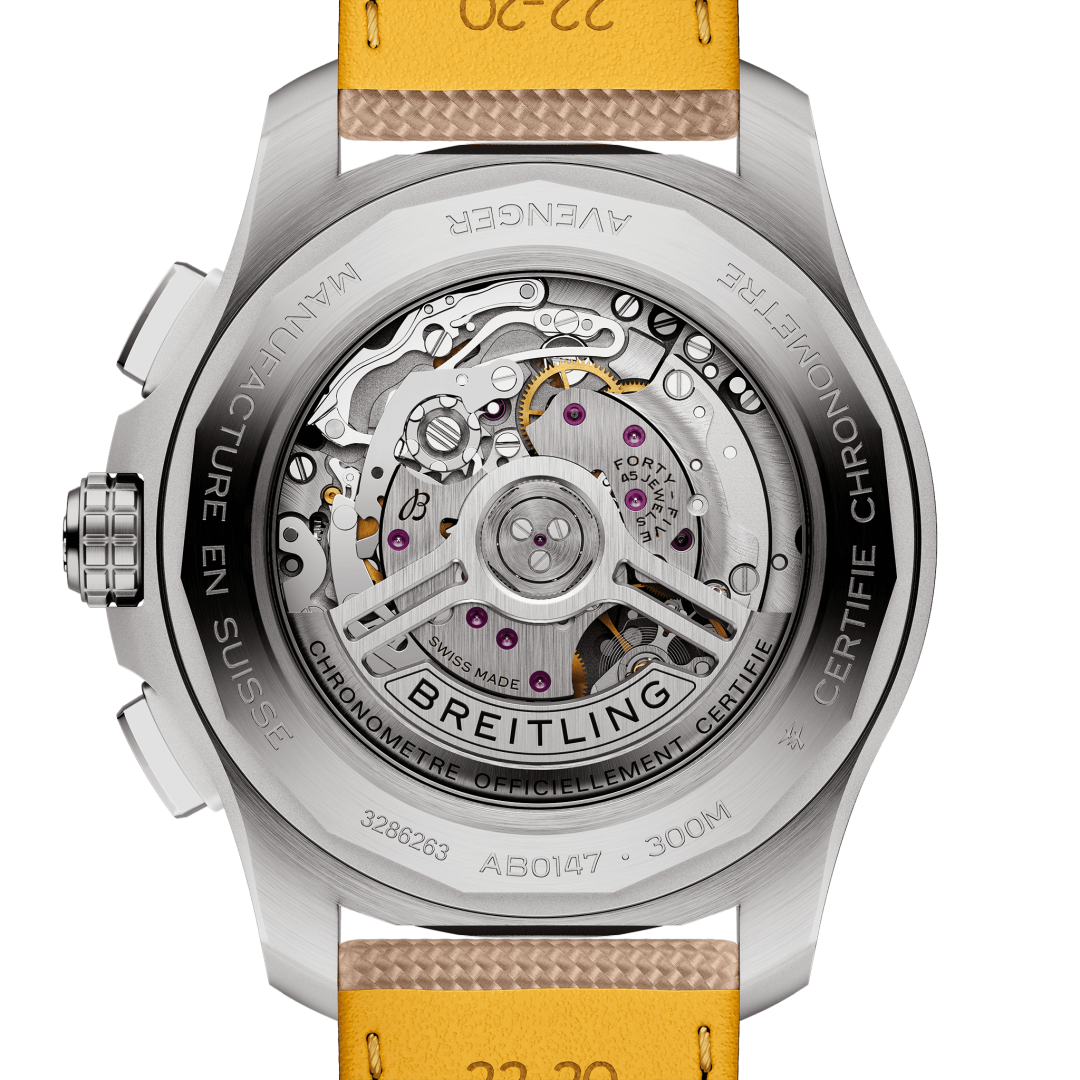 luxury watches Breitling Avenger B01 Chronograph 44 In-house movement, Vater resist 300M, 44 mm. The watch has functions luminescence, stopwatch and date . Basic parameters of the watch are: movement type is mechanical chronograph with automatic winding, water resistance is 300 m, dial colour is beige and strap material is leather.