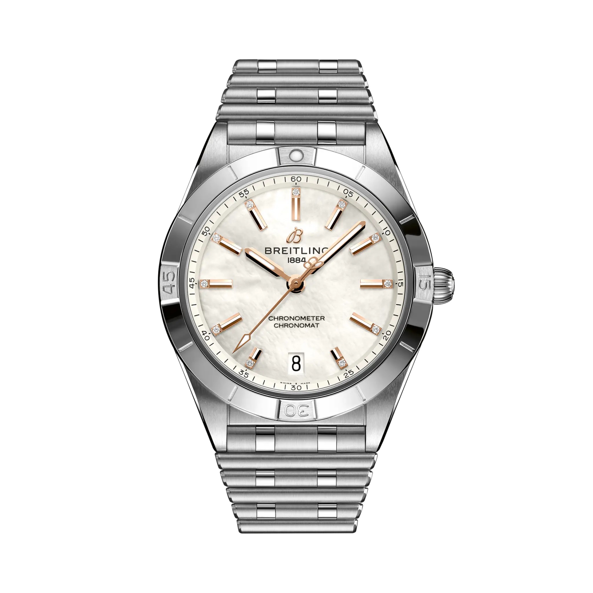 luxury watches Breitling Chronomat 36 Diamonds, Automatic, 36 mm. The watch has functions luminescence and date . Basic parameters of the watch are: strap material is steel, water resistance is 100 m, movement type is mechanical watch with automatic winding and dial colour is pearl.