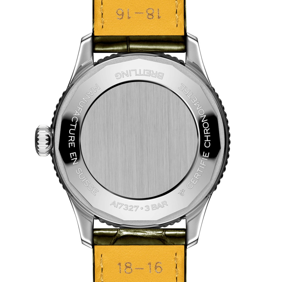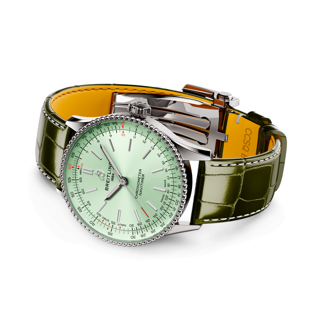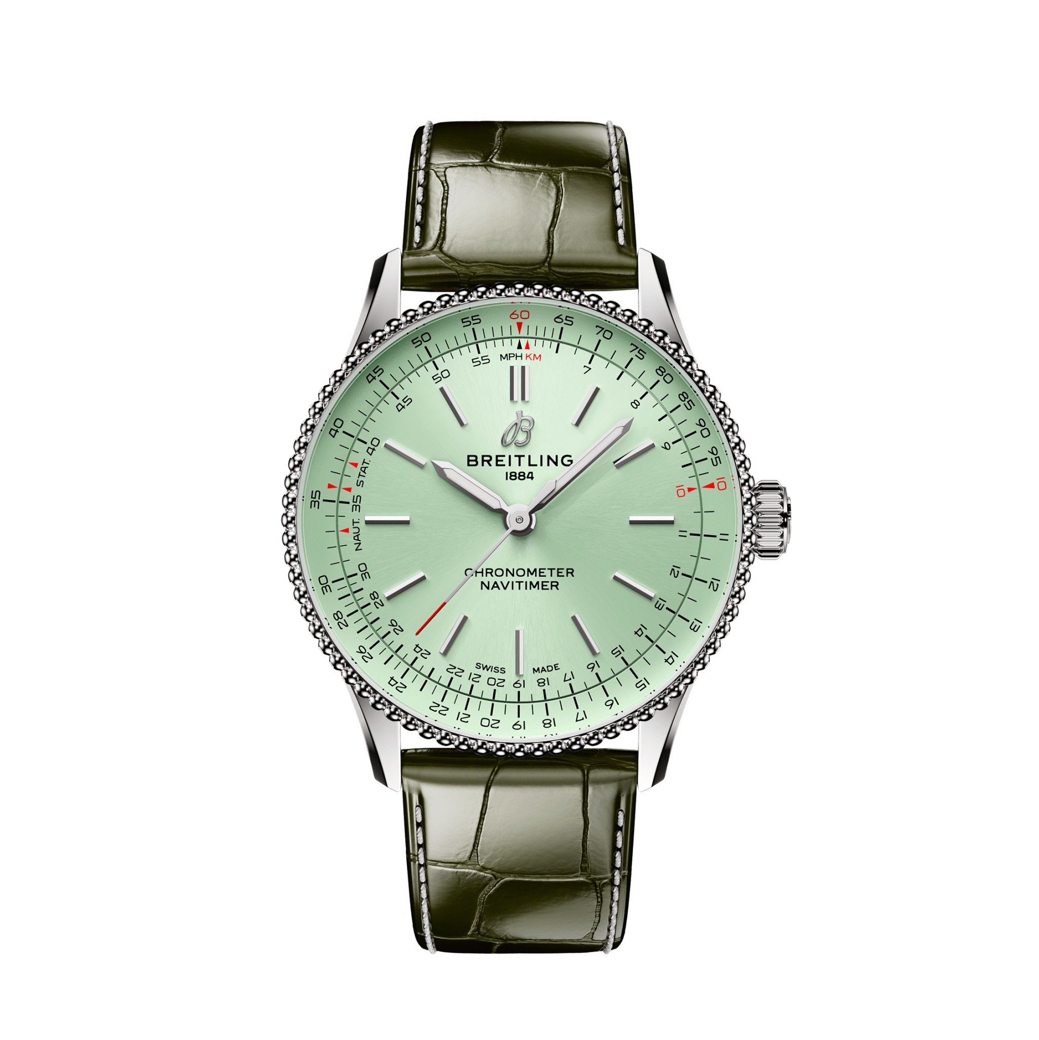 luxury watches Breitling Navitimer Automatic 36 Automatic, 36 mm. The watch has functions luminescence. Basic parameters of the watch are: movement type is mechanical watch with automatic winding, water resistance is 30 m, strap material is leather and dial colour is green.
