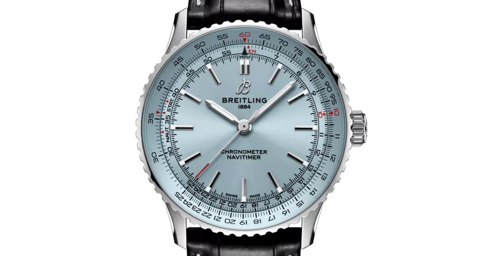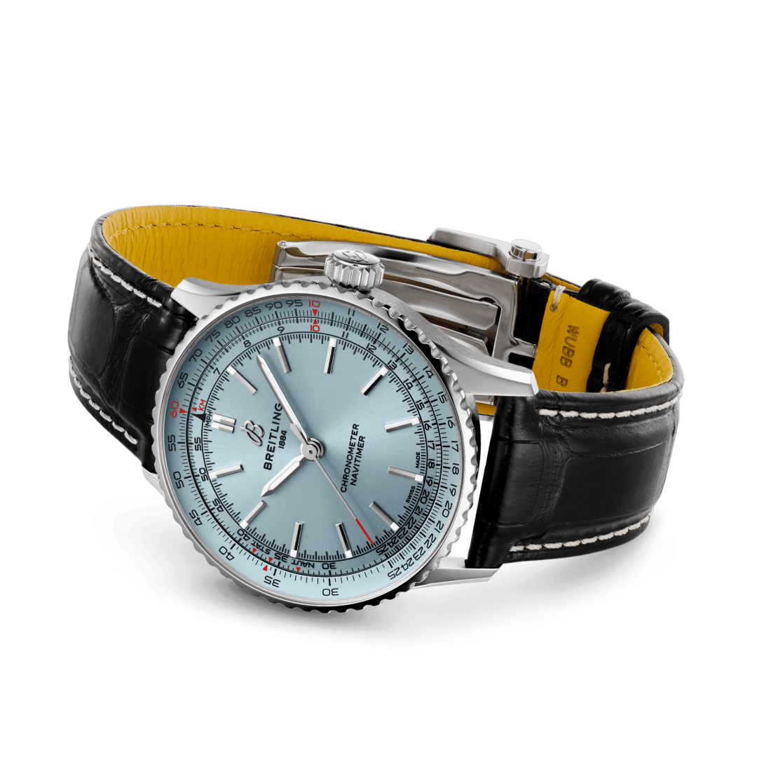 luxury watches Breitling Navitimer Automatic 41 Automatic. The watch has functions luminescence, date and logaritmic ruler. Basic parameters of the watch are: movement type is mechanical watch with automatic winding, water resistance is 30 m, strap material is leather and dial colour is blue.