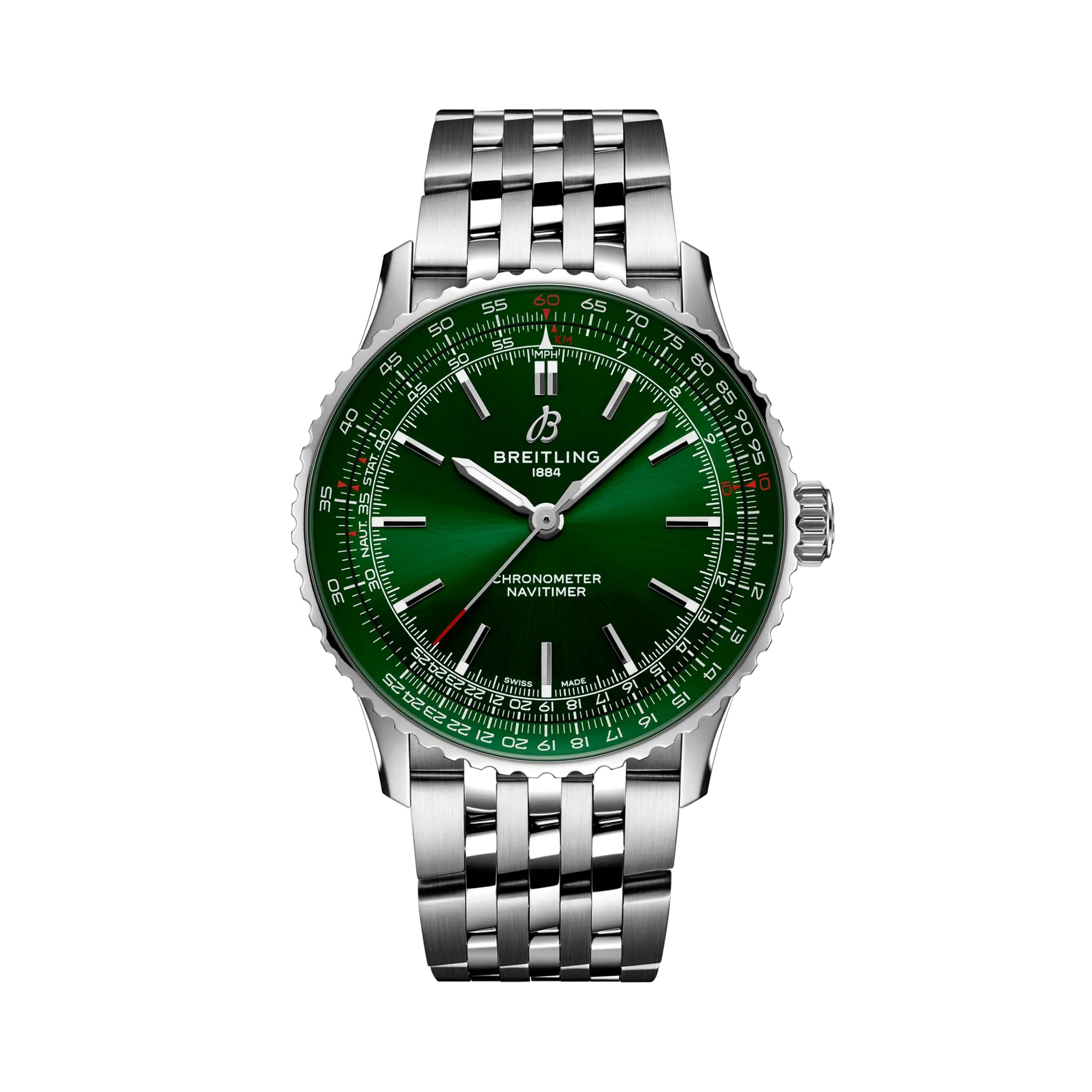 luxury watches Breitling Navitimer Automatic 41 Automatic. The watch has functions luminescence, date and logaritmic ruler. Basic parameters of the watch are: movement type is mechanical watch with automatic winding, water resistance is 30 m, dial colour is green and strap material is steel.