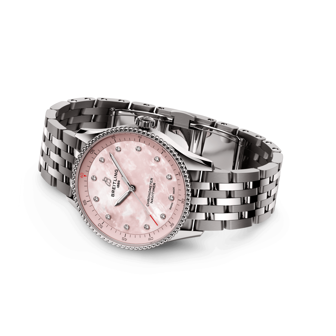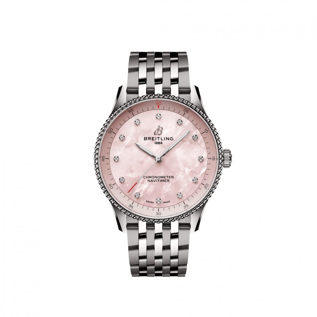 luxury watches Breitling Navitimer 32 Diamonds, Quartz, 32 mm. The watch has functions luminescence and E.O.L.. Basic parameters of the watch are: water resistance is 30 m, dial colour is pearl and pink, movement type is Quartz watches and strap material is steel.