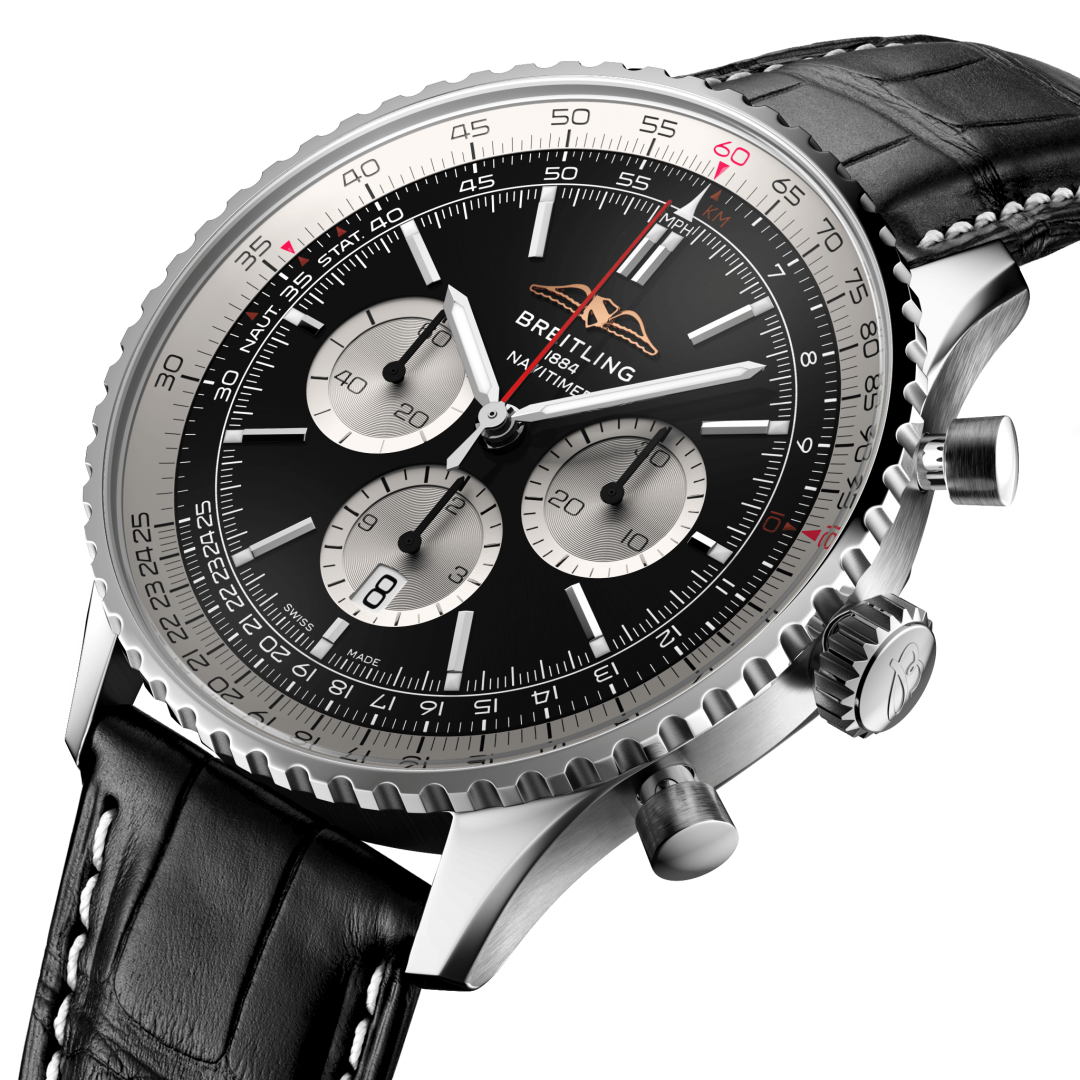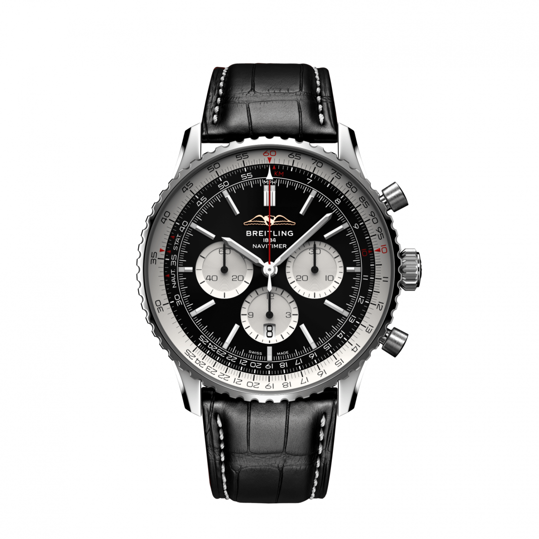 luxury watches Breitling Navitimer B01 Chronograph 46 In-house Calibre, 46 mm. The watch has functions luminescence, stopwatch, date and logaritmic ruler. Basic parameters of the watch are: movement type is mechanical chronograph with automatic winding, strap material is leather, water resistance is 30 m and dial colour is black.