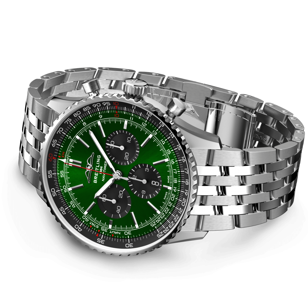 luxury watches Breitling Navitimer B01 Chronograph 46 In-house Calibre, 46 mm. The watch has functions luminescence, stopwatch, date and logaritmic ruler. Basic parameters of the watch are: movement type is mechanical chronograph with automatic winding, water resistance is 30 m, strap material is steel and dial colour is green.