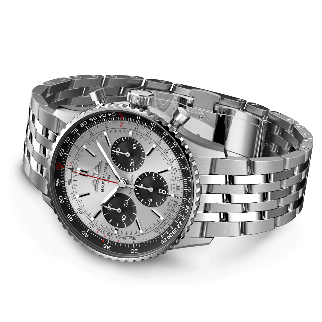 luxury watches Breitling Navitimer B01 Chronograph 43 In-house Calibre, 43 mm. The watch has functions luminescence, stopwatch, date and logaritmic ruler. Basic parameters of the watch are: movement type is mechanical chronograph with automatic winding, water resistance is 30 m, dial colour is black and silver and strap material is steel.