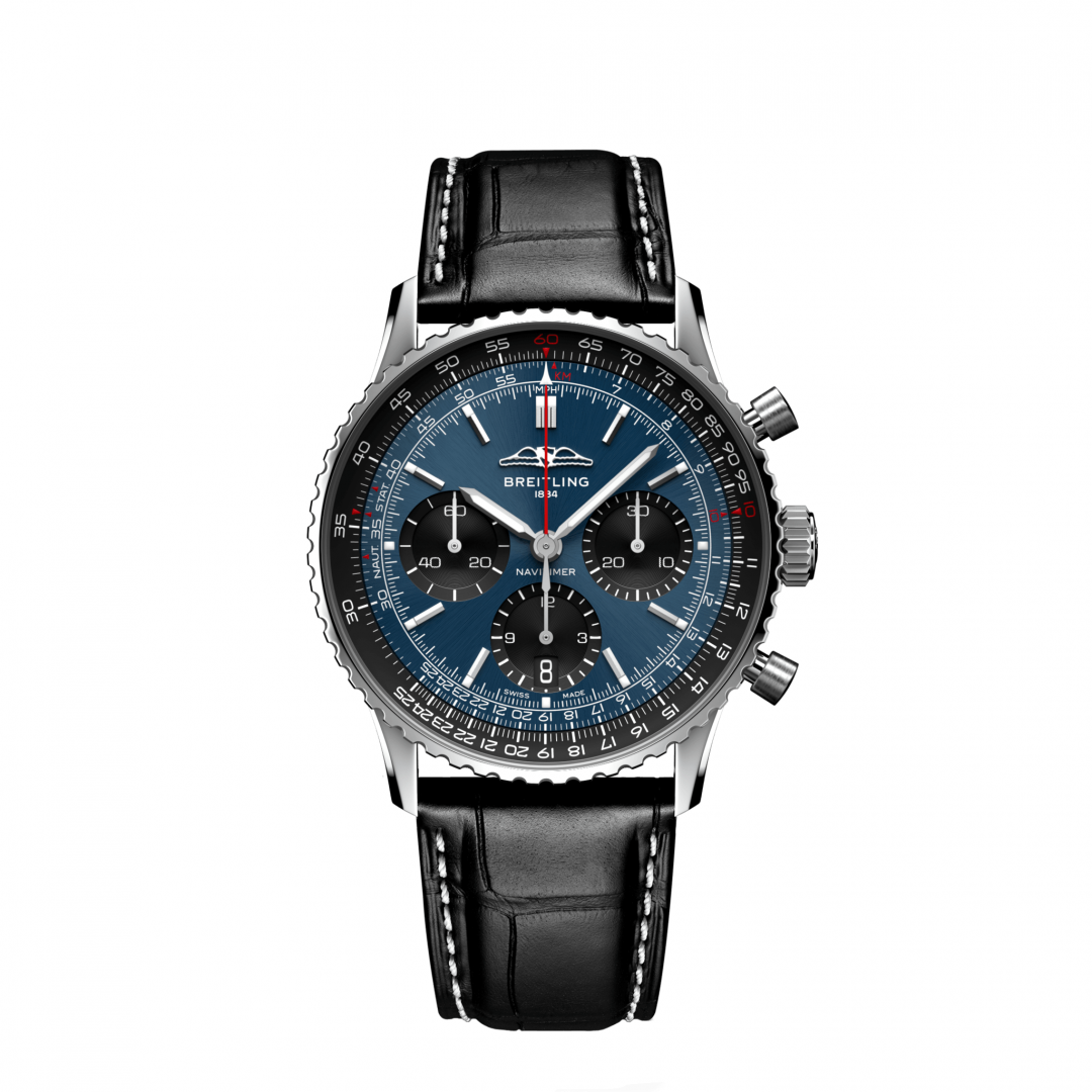 luxury watches Breitling Navitimer B01 Chronograph 41 In-house Calibre, 41 mm. The watch has functions luminescence, stopwatch, date and logaritmic ruler. Basic parameters of the watch are: movement type is mechanical chronograph with automatic winding, water resistance is 30 m, dial colour is black and blue and strap material is leather.