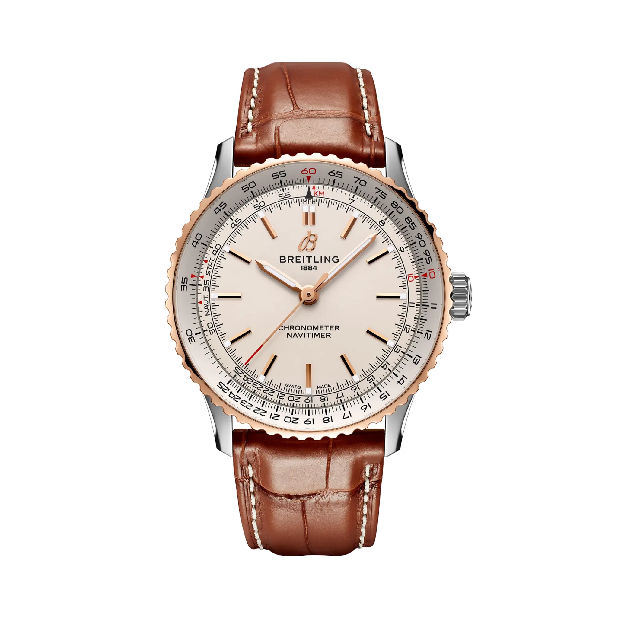 luxury watches Breitling Navitimer Automatic 41 Gold, Automatic. The watch has functions luminescence, date and logaritmic ruler. Basic parameters of the watch are: movement type is mechanical watch with automatic winding, water resistance is 30 m, strap material is leather and dial colour is beige.