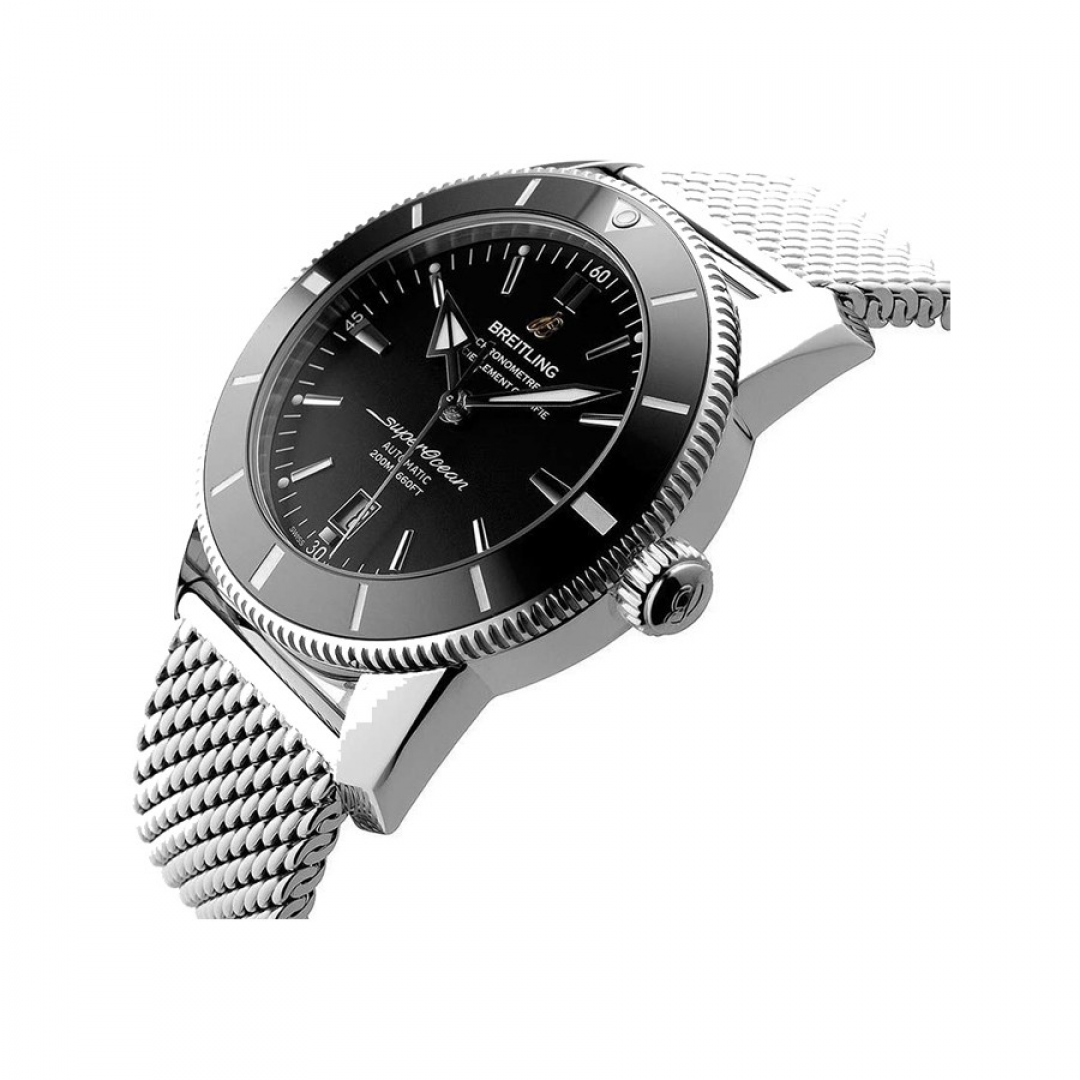 Luxury watches Breitling Superocean Héritage B20 Automatic 46 Manufaktúrny kaliber, Vode odolnosť 200M, 46 mm. The watch has functions luminescence and date . Basic parameters of the watch are: movement type is mechanical watch with automatic winding, strap material is steel, water resistance is 200 m and dial colour is black.