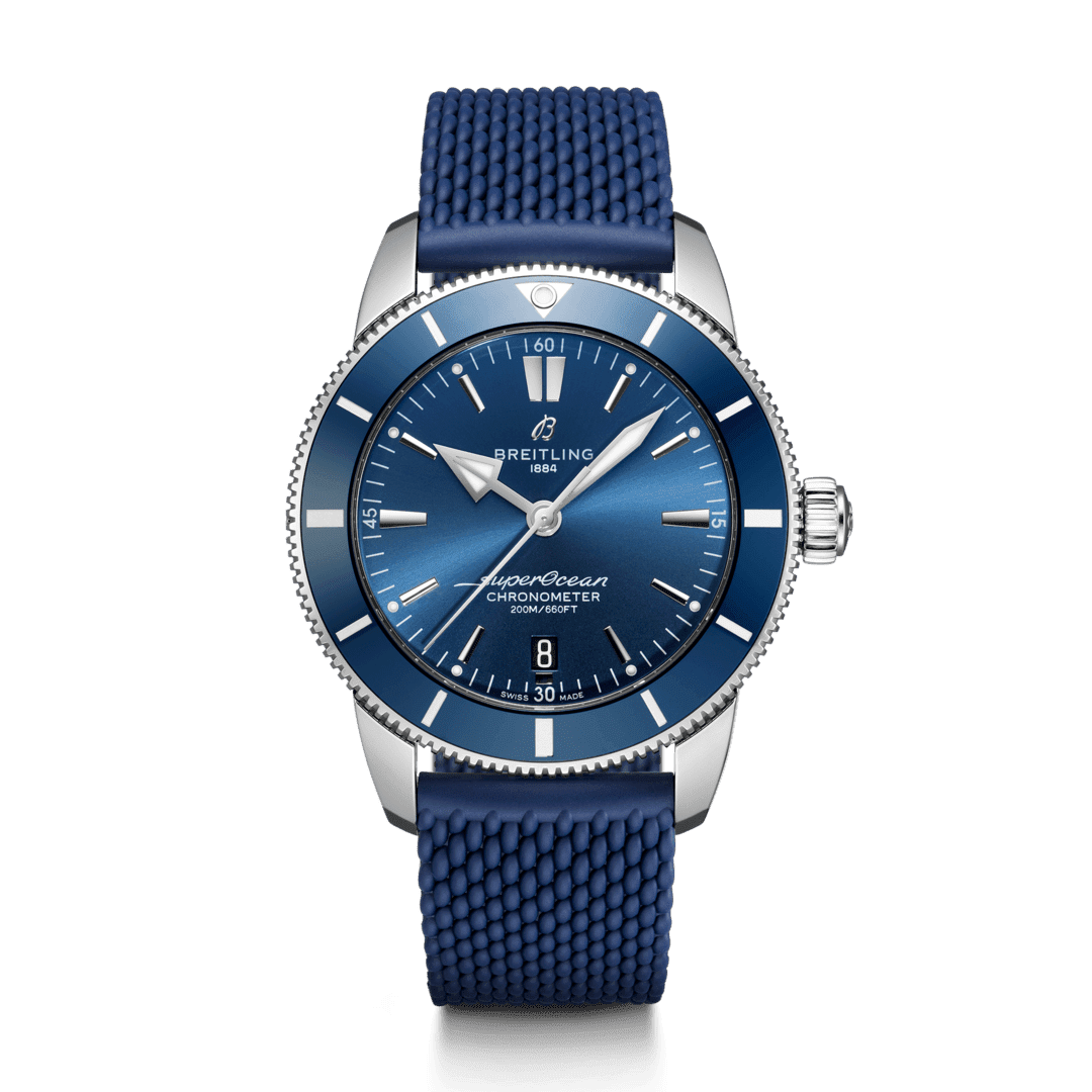 Luxury watches Breitling Superocean Héritage B20 Automatic 44 In-house Calibre, Ceramic, 44mm. The watch has functions date and luminescence. Basic parameters of the watch are: water resistance is 200 m, movement type is mechanical watch with automatic winding, dial colour is blue and strap material is rubber.