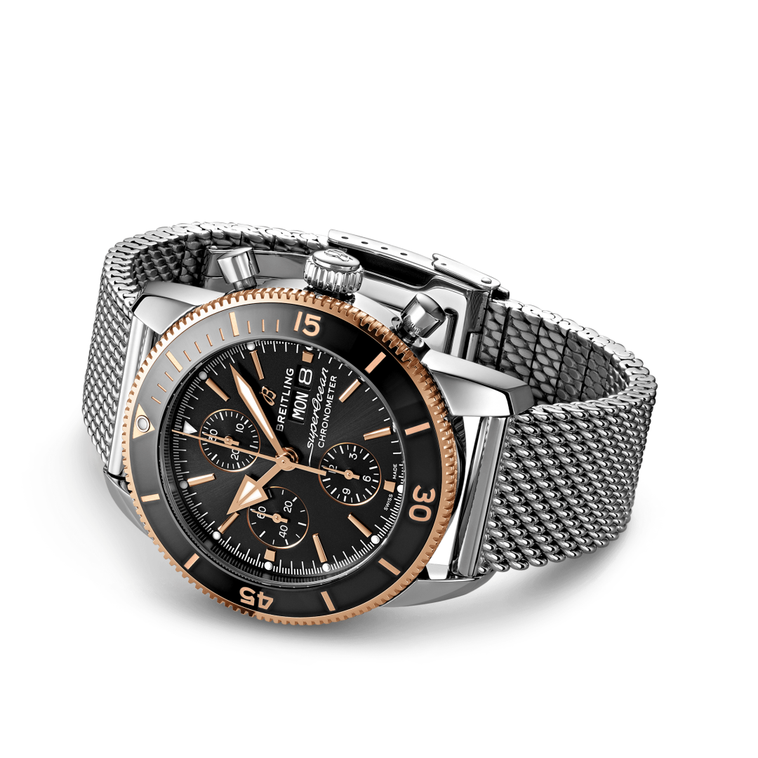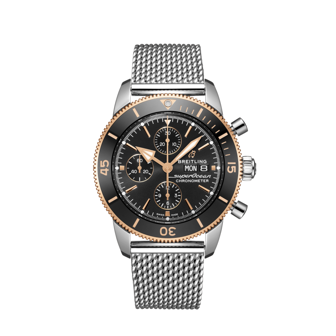 Men's luxury watches Breitling Superocean Héritage CHRONOGRAPH 44 44mm Stainless steel & 18k red gold - Black. The watch has functions date and stopwatch. Basic parameters of the watch are: dial colour is black, bracelet is steel, water resistance is 200 m and movement type is mechanical chronograph with automatic winding.