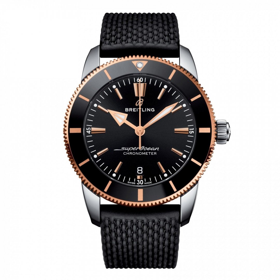 Luxury watches Breitling Superocean Héritage B20 Automatic 44 Manufaktúrni kalibr, Ceramic, 44mm. The watch has functions date and luminescence. Basic parameters of the watch are: strap material is rubber, water resistance is 200 m, dial colour is black and golden and movement type is mechanical watch with automatic winding.