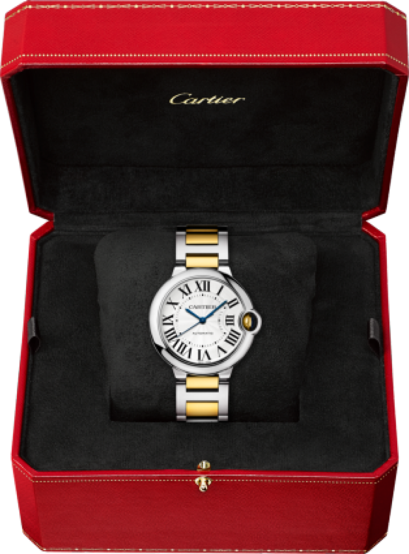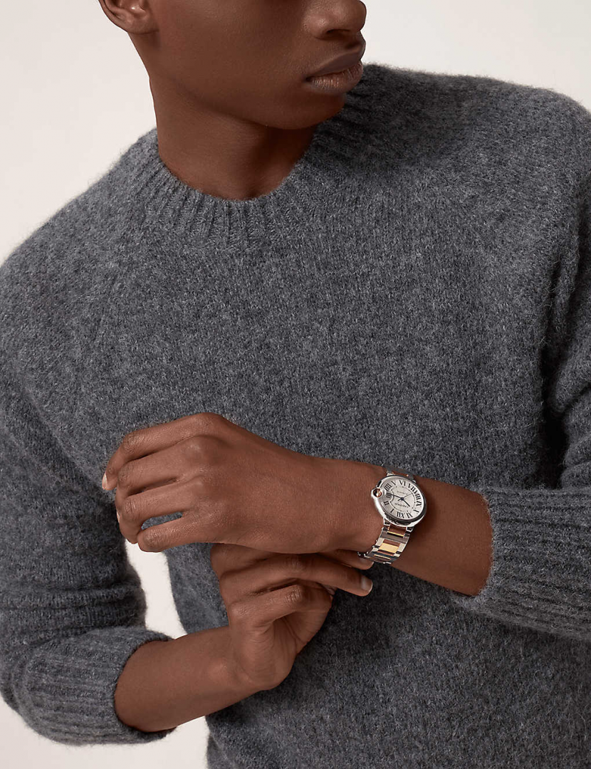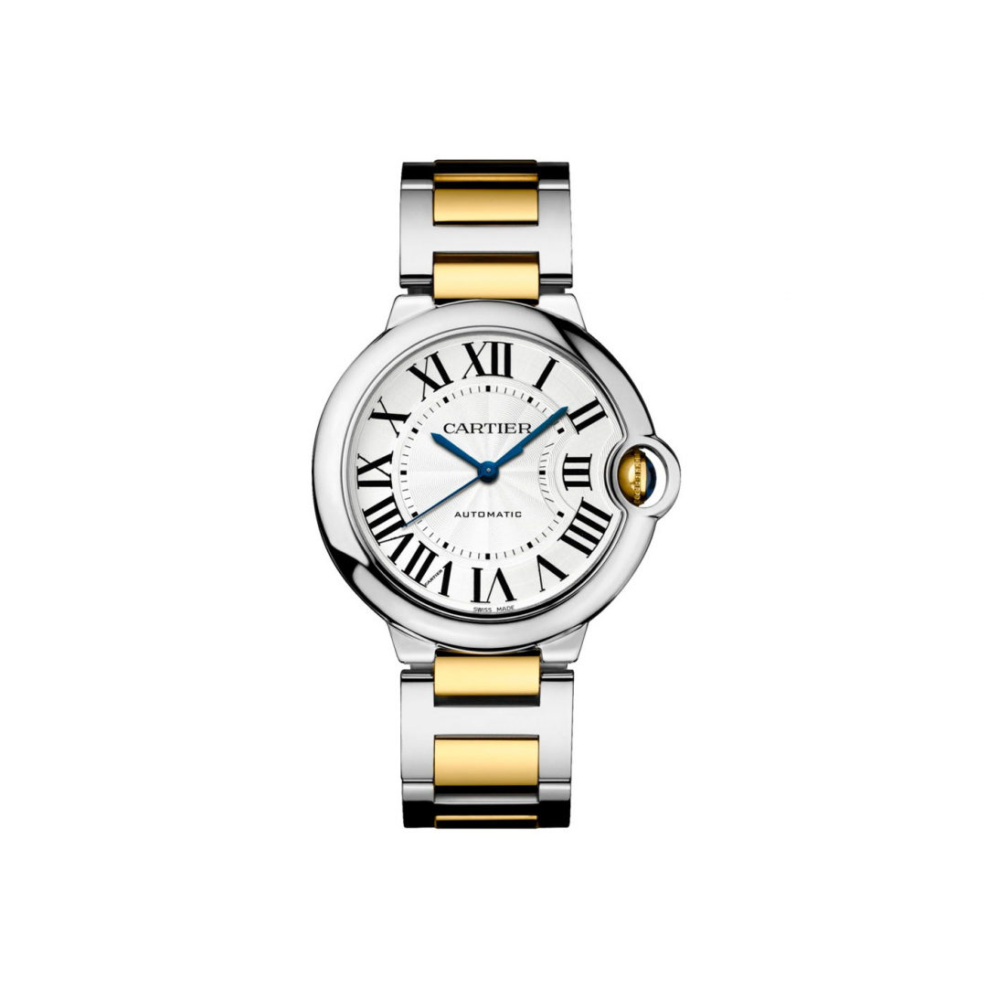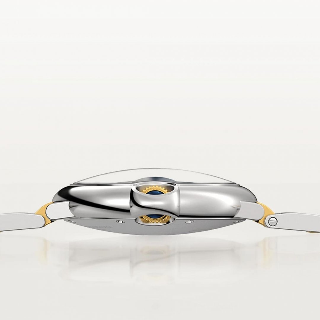 Ballon Bleu de Cartier watch, 36 mm, self-winding mechanical movement. Steel case, fluted 18K yellow gold crown set with a synthetic cabochon-shaped spinel, silvered guilloché opaline dial, Roman numerals, blued-steel sword-shaped hands, sapphire crystal, steel bracelet with central 18K pink gold links in the middle. Case dimensions: diameter: 36.6 mm, case thickness: 12.05 mm. Water-resistant to 3 bar (approx. 30 meters/100 feet).