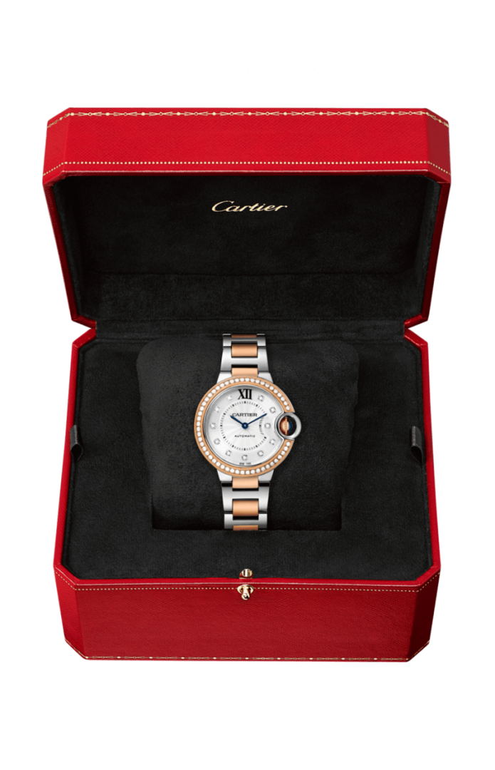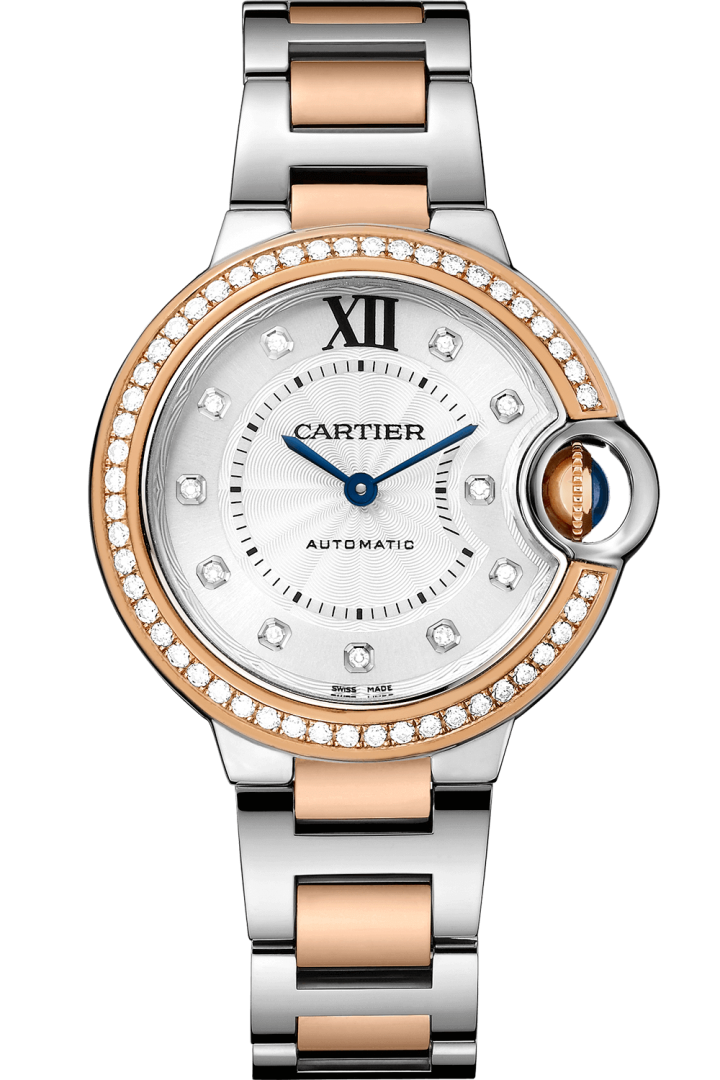Ballon Bleu de Cartier watch, 33 mm, self-winding mechanical movement.Steel case and 18K pink gold fluted crown decorated with a synthetic cabochon-shaped spinel.18K pink gold bezel set with 50 brilliant-cut diamonds totaling 0.63 carats.12-zone flinqué dial set with 11 brilliant-cut diamonds totaling 0.05 carats.Blued-steel sword-shaped hands. Sapphire crystal. Steel bracelet with central 18K pink gold links in the middle. Wrist size: 175 mm.9.96 mm thick. Water resistant to 3 bar (approx.30 meters/100 feet).
