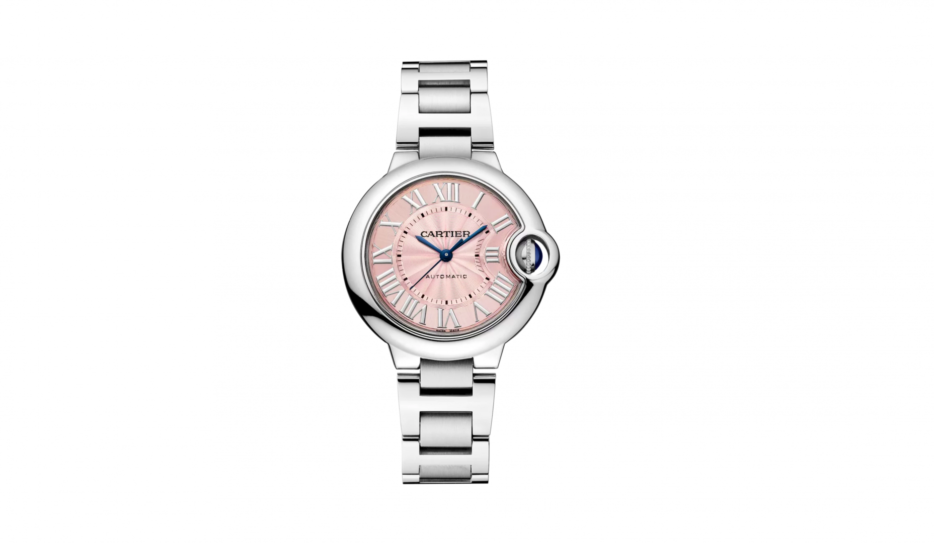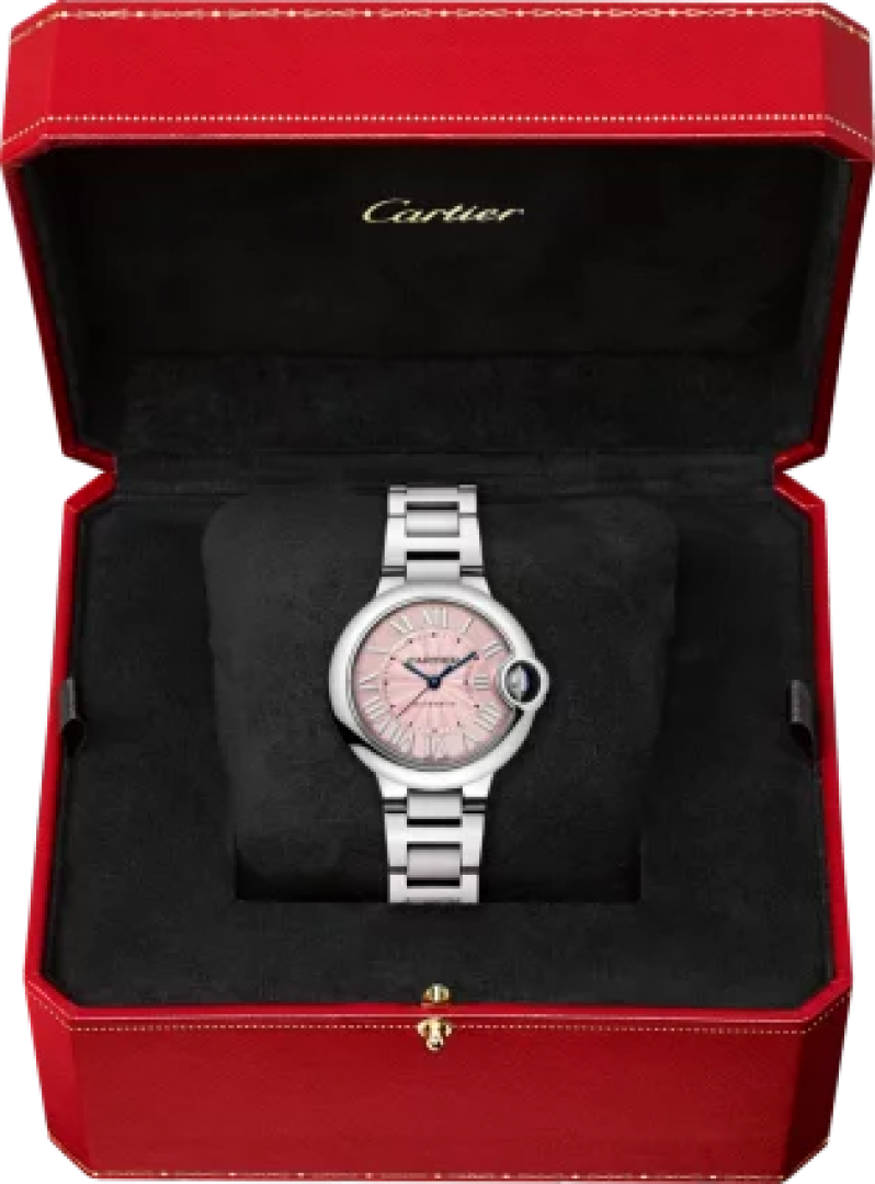 Ballon Bleu de Cartier watch, 33 mm, mechanical movement with automatic winding. Steel case, fluted crown set with a cabochon synthetic spinel. Pink guilloché dial. Blued-steel sword-shaped hands. Sapphire crystal. Steel interchangeable bracelet. Thickness: 9.96 mm. Water-resistant up to 3 bar (approx. 30 meters/100 feet).