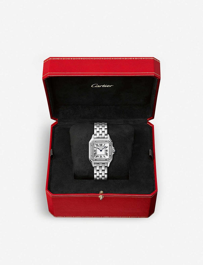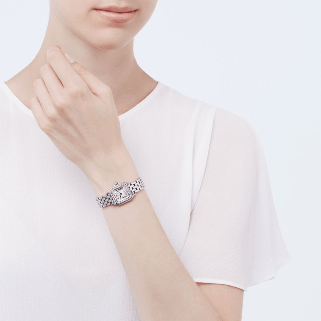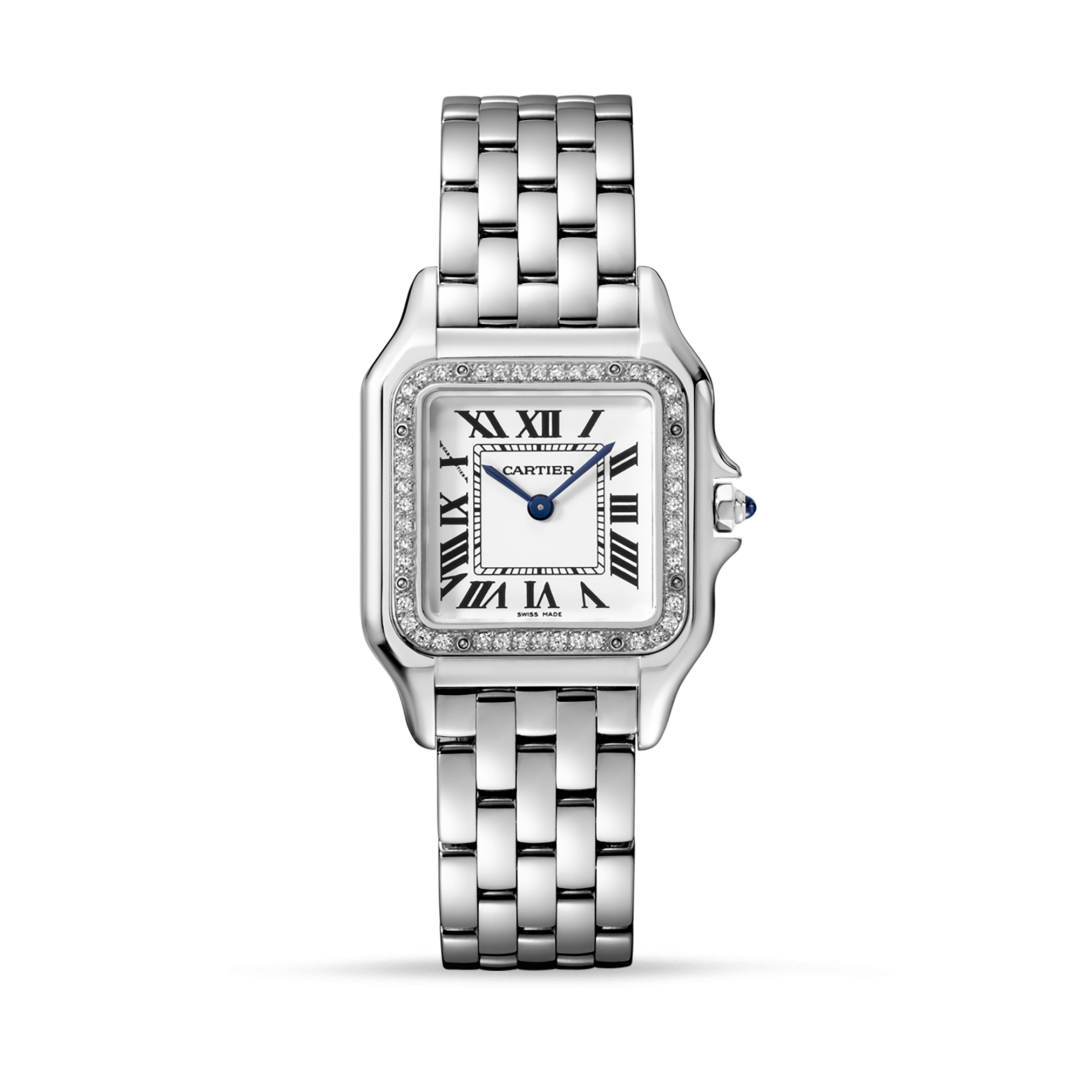 Panthère de Cartier watch, medium model, quartz movement. Case in steel, bezel set with brilliant-cut diamonds, dimensions: 27 mm x 37 mm, thickness: 6 mm, crown set with a synthetic blue spinel, silvered dial, blued-steel sword-shaped hands, steel bracelet, water-resistant to 3 bar (approx. 30 meters).