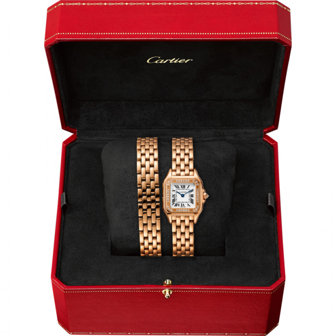 Panthère de Cartier watch, small model, quartz movement. Case in 18K rose gold set with brilliant-cut diamonds, dimensions: 22 mm x 30 mm, thickness: 6 mm, crown set with a diamond, silvered dial, blued-steel sword-shaped hands, 18K rose gold double loop bracelet, water-resistant to 3 bar (approx. 30 meters).