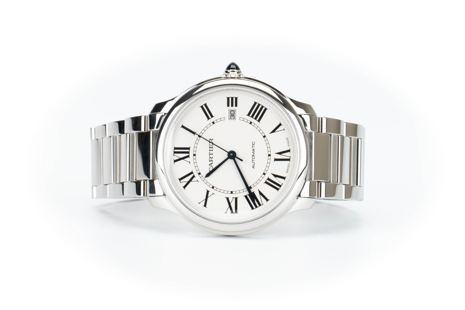 Ronde Must de Cartier watch, 40 mm, mechanical movement with automatic winding, calibre 1847 MC. Steel case, beaded crown set with a synthetic cabochon-shaped spinel, sandblasted silvered dial, blued-steel sword-shaped hands, sapphire crystal, steel strap fitted with an interchangeability system. Thickness: 9.62 mm. Water-resistant to 3 bar (approx. 30 metres).