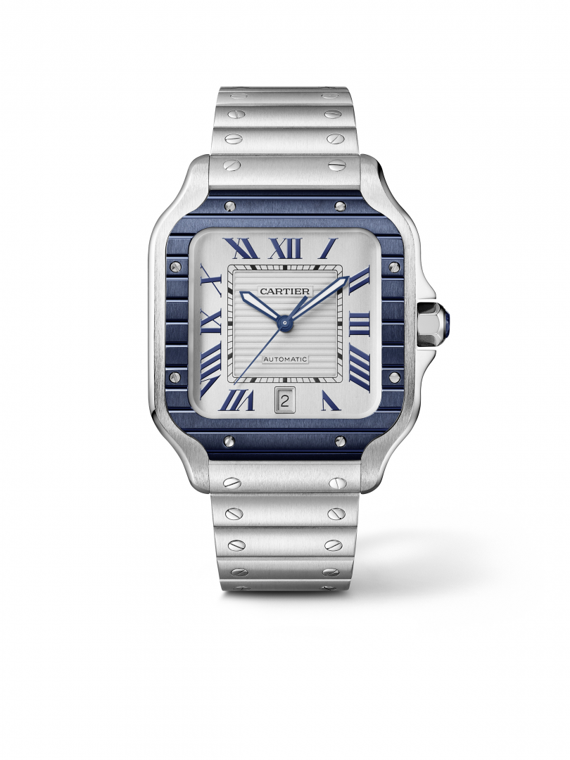 Santos de Cartier watch, large model, Manufacture mechanical movement with automatic winding, caliber 1847 MC. Steel case, PVD bezel, steel crown set with a faceted blue synthetic spinel, gray striated dial, steel sword-shaped hands with luminescent material also on the hour markers, sapphire crystal. Steel strap with "SmartLink" adjustment system. Second strap in blue rubber, with interchangeable steel deployant buckle. Both straps are fitted with the "QuickSwitch" interchangeable system. Case width: 39.8 mm, thickness: 9.38 mm. Water-resistant up to 10 bar (approx. 100 meters/330 feet).