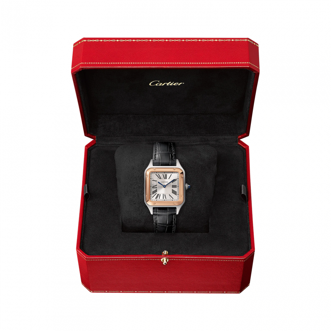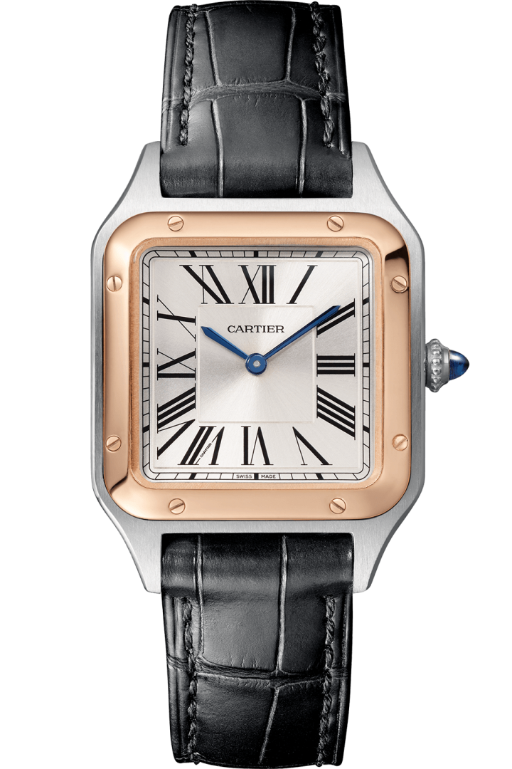 Santos-Dumont watch, small model, high autonomy quartz movement (~ 6 years). Steel case, 18K pink gold bezel, steel beaded crown set with a blue synthetic cabochon-shaped spinel, satin-brushed silver dial with sunray effect, Roman numerals, blued-steel sword-shaped hands, sapphire crystal. Strap in black alligator leather, with steel ardillon buckle. Case dimensions: 38 mm x 27.5 mm, thickness: 7.3 mm. Water-resistant up to 3 bar (approx. 30 meters/100 feet).