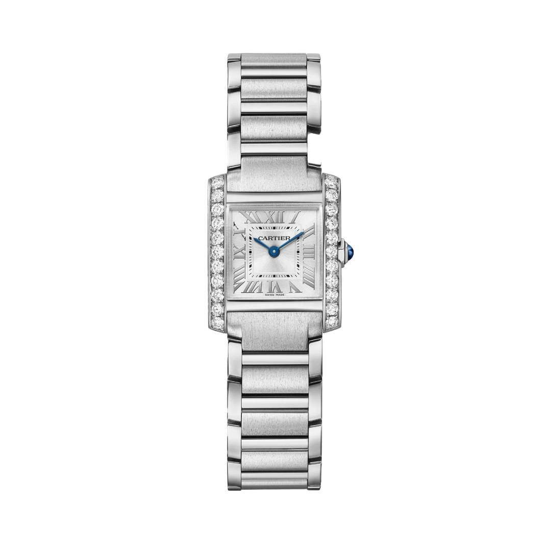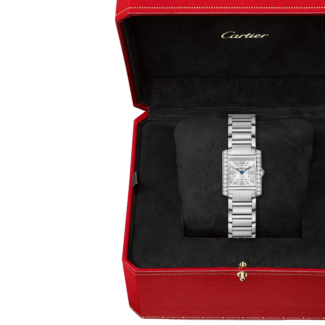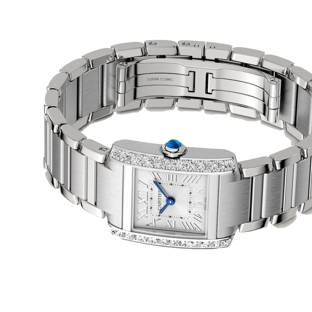Tank Française watch, small model, quartz movement. Steel case set with 22 diamonds totalling 0.70 carats, steel faceted crown with a synthetic blue cabochon-shaped spinel. Silvered sunray dial, blued-steel sword-shaped hands, sapphire crystal. Steel bracelet. Case dimensions: 25.7 mm x 21.2 mm, thickness: 6.8 mm. Water-resistant up to 3 bar (approx. 30 metres).