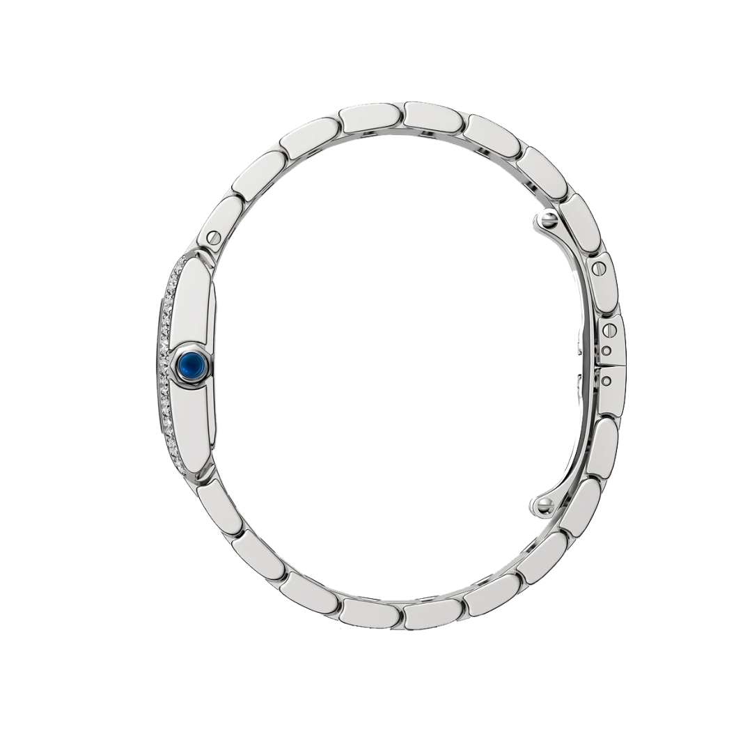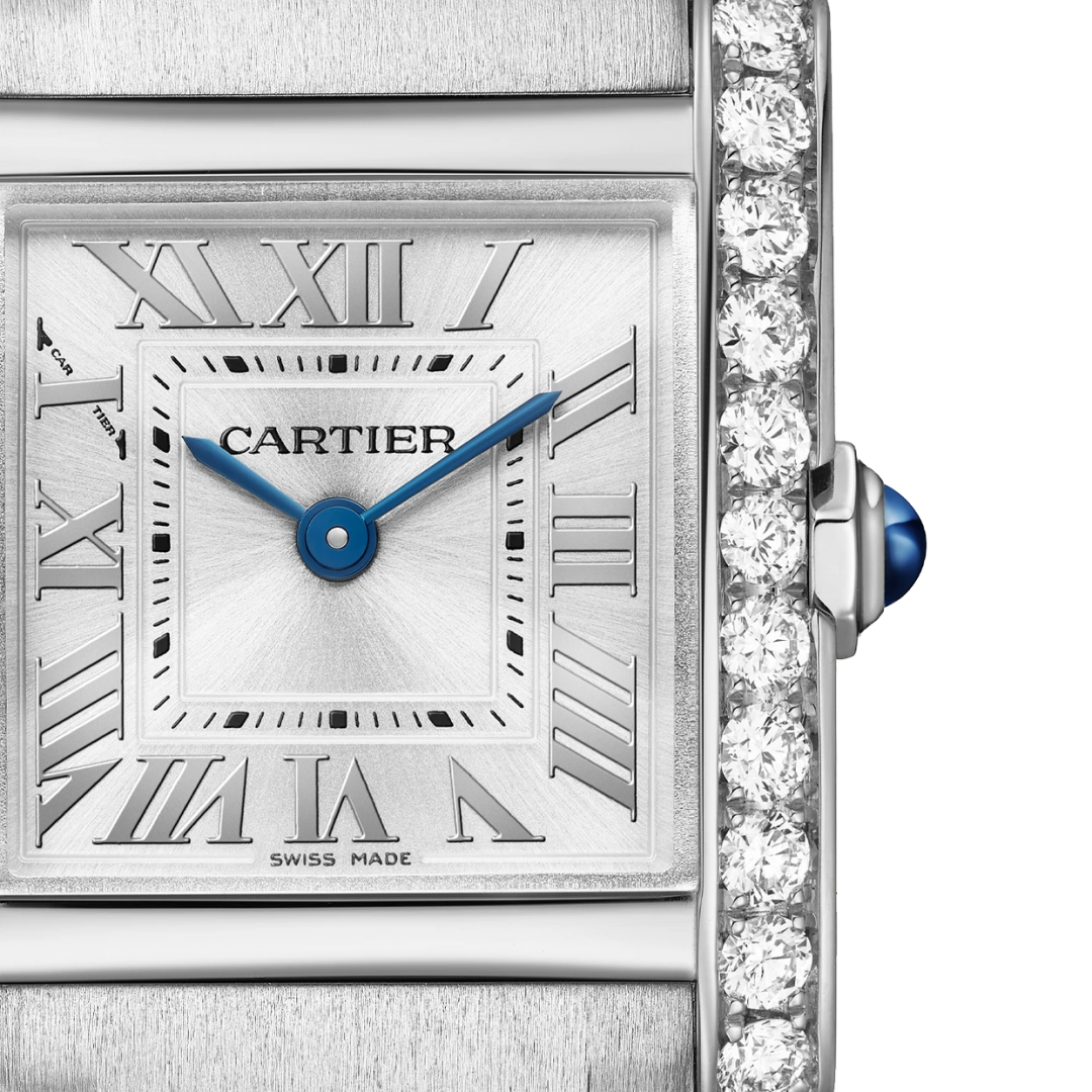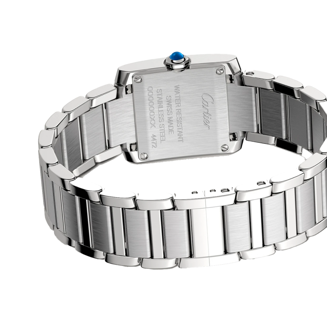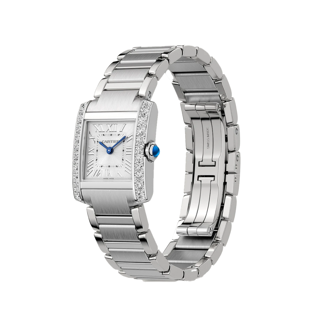 Tank Française watch, small model, quartz movement. Steel case set with 22 diamonds totalling 0.70 carats, steel faceted crown with a synthetic blue cabochon-shaped spinel. Silvered sunray dial, blued-steel sword-shaped hands, sapphire crystal. Steel bracelet. Case dimensions: 25.7 mm x 21.2 mm, thickness: 6.8 mm. Water-resistant up to 3 bar (approx. 30 metres).