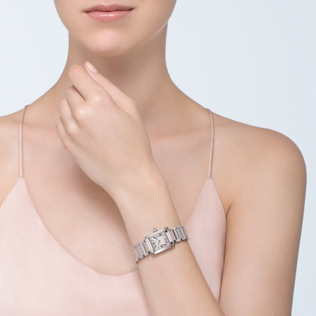 The Tank Française has updated the legacy of the Tank wristwatch with a chain-link bracelet. The curved case, boldly set at the center of the bracelet to seamlessly mimic its lines, introduces a new Tank family that subscribes to the same modern design aesthetic.