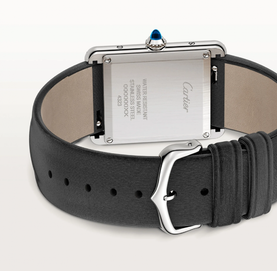 Tank Must watch, large model, quartz movement. Steel case, bezel set with 42 brilliant-cut diamonds totalling 0.48 carats, beaded crown set with a synthetic cabochon-shaped spinel, silvered dial, blued-steel sword-shaped hands, strap in black brushed calfskin, steel ardillon buckle. Case dimensions: 33.7 mm x 25.5 mm, thickness: 6.6 mm. Water-resistant to 3 bar (approx. 30 metres).