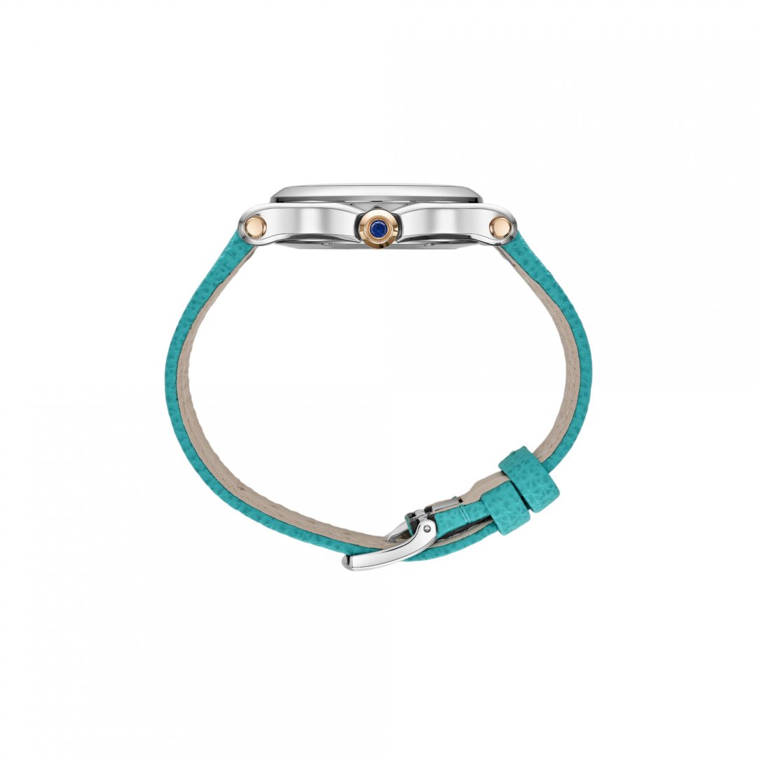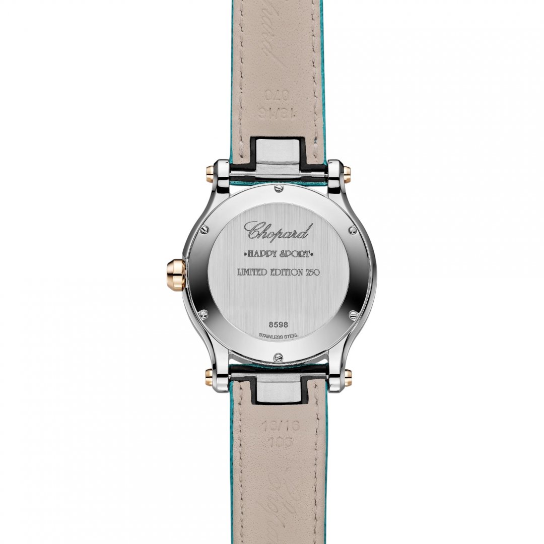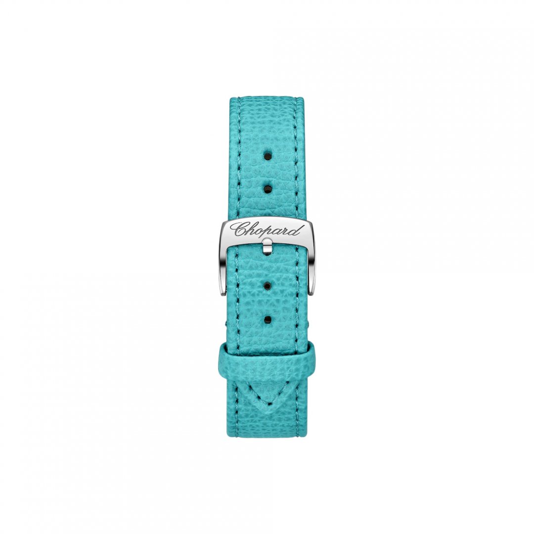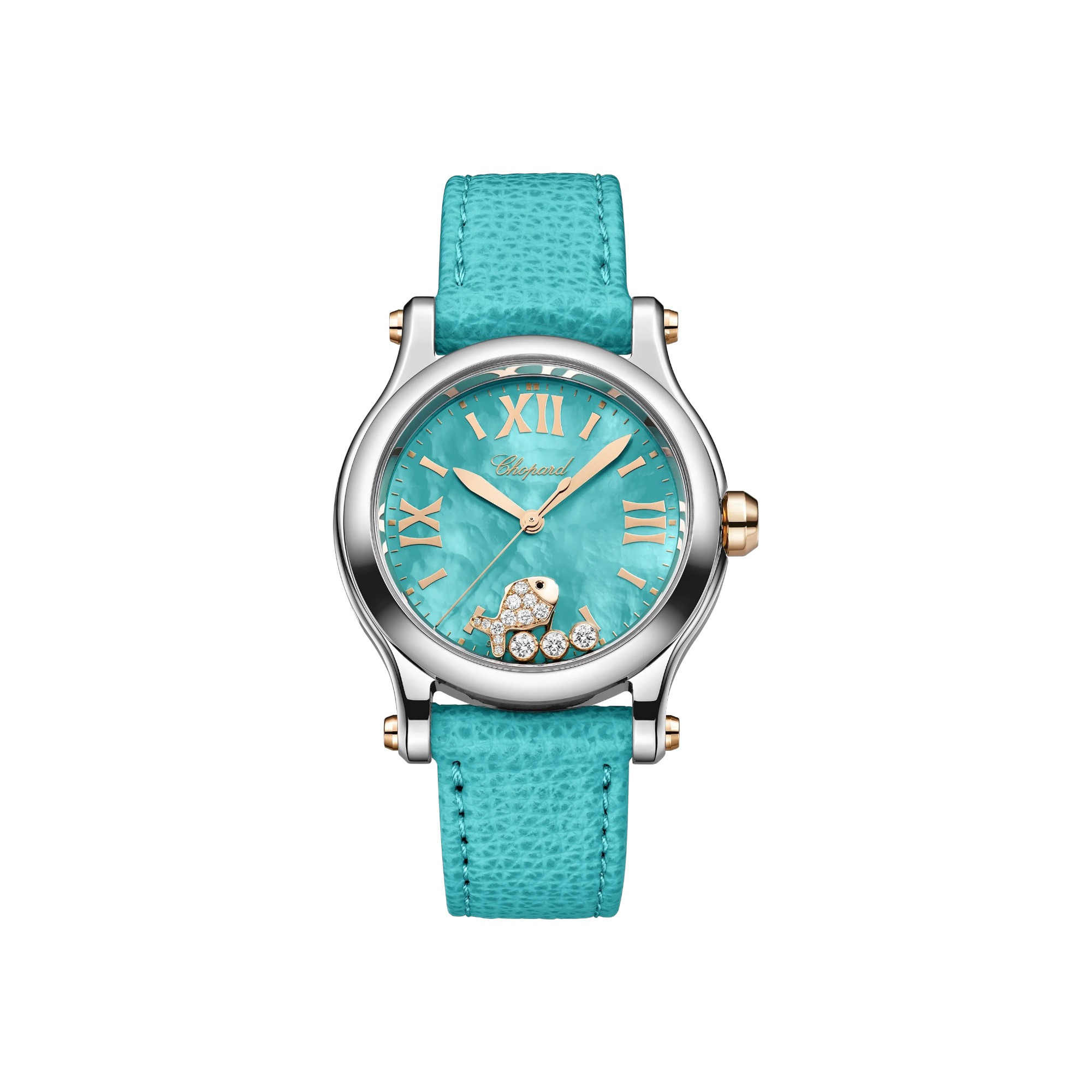 The Chopard Happy Fish is a limited-edition (250 pieces) ladies’ watch featuring a 36 mm case crafted from stainless steel and 18-carat rose gold. It is defined by a turquoise textured mother-of-pearl dial with “dancing diamonds” – free-moving diamonds that rhythmically glide around the dial, and a total diamond weight of approximately 0.22 carats. The watch is powered by a quartz movement, protected by sapphire crystal and a solid case back. It comes with a matte turquoise leather strap (interchangeable) and pin buckle.