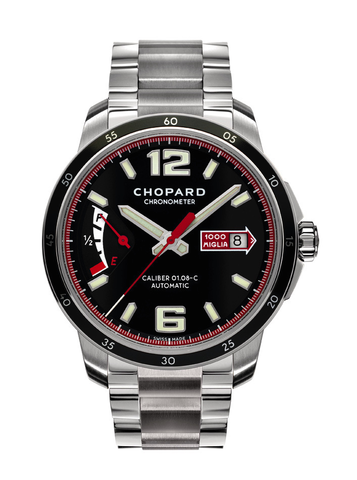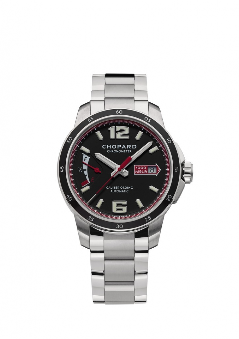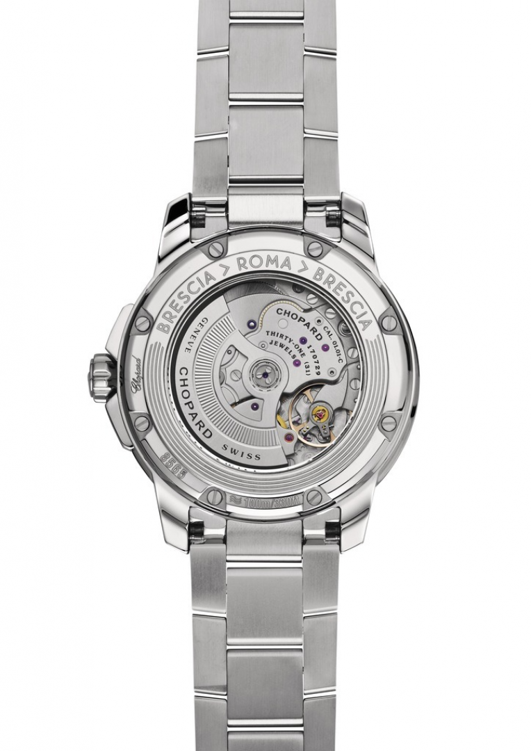 Power, resistance, and aesthetics come together in the Mille Miglia GTS Power Control, a resolutely masculine timepiece bearing all the hallmarks of Chopard expertise. Housing the self-winding Chopard Calibre 01.08-C and beating at a frequency of 28,800 v.p.h, this stainless steel watch on a matching bracelet features an emblematic black dial with a power-reserve indicator at 9 o'clock. Chronometer certified by the COSC, the movement is equipped with a stop-seconds function allowing ultra-precise adjustment. Water-resistant to 100 meters, the 43mm case is equipped with an anti-reflective, scratch-resistant sapphire crystal. The movement, driven by a tungsten oscillating weight, can be admired through the sapphire crystal case back.