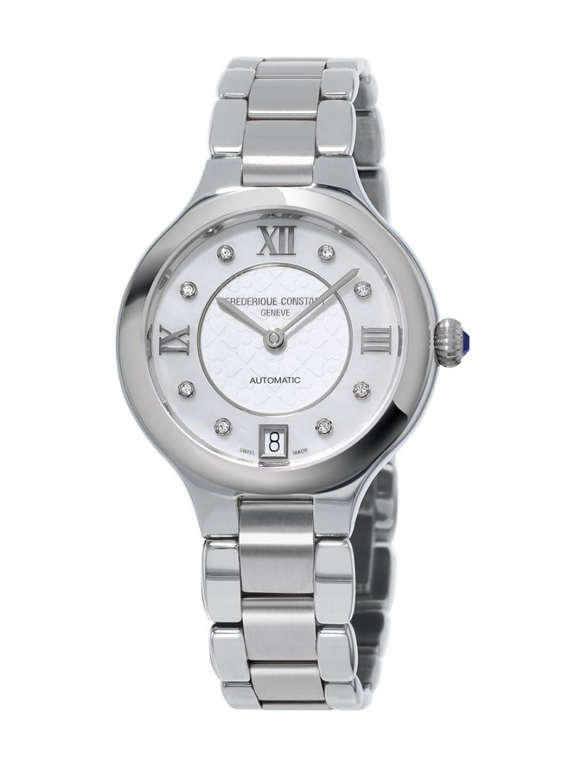Luxury watches Frederique Constant Delight . The watch has functions date. Basic parameters of the watch are: dial colour is white, movement type is mechanical watch with automatic winding, bracelet is steel and water resistance is 30 m.