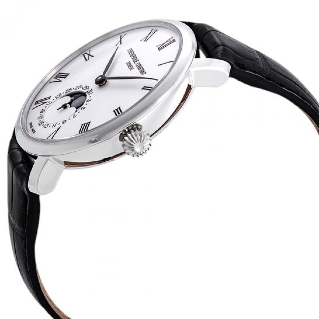 This refined Swiss timepiece embodies timeless elegance. The 42 mm polished stainless steel case with its slim 11 mm profile ensures a comfortable fit on the wrist. The silver-toned dial features Roman numerals and elegant dauphine hands, while the complication at 6 o’clock combines a moonphase display with a date indicator. At its heart beats the in-house developed FC-705 automatic calibre, offering a 42-hour power reserve and showcased through a transparent case back. Completed with a black alligator leather strap, scratch-resistant sapphire crystal and 30 meters of water resistance, this watch is the perfect blend of sophistication and functionality.