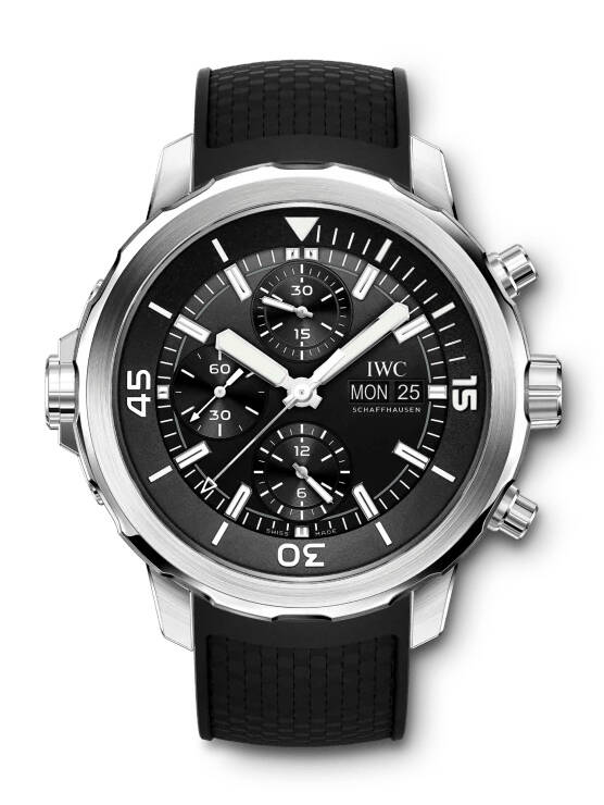 luxury watches IWC Schaffhausen Aquatimer Chronograph Water resistance 300M, 44 mm. The watch has functions luminescence, date , stopwatch, Day-Date and Helium release valve. Basic parameters of the watch are: water resistance is 300 m, movement type is mechanical chronograph with automatic winding, dial colour is black and strap material is rubber.