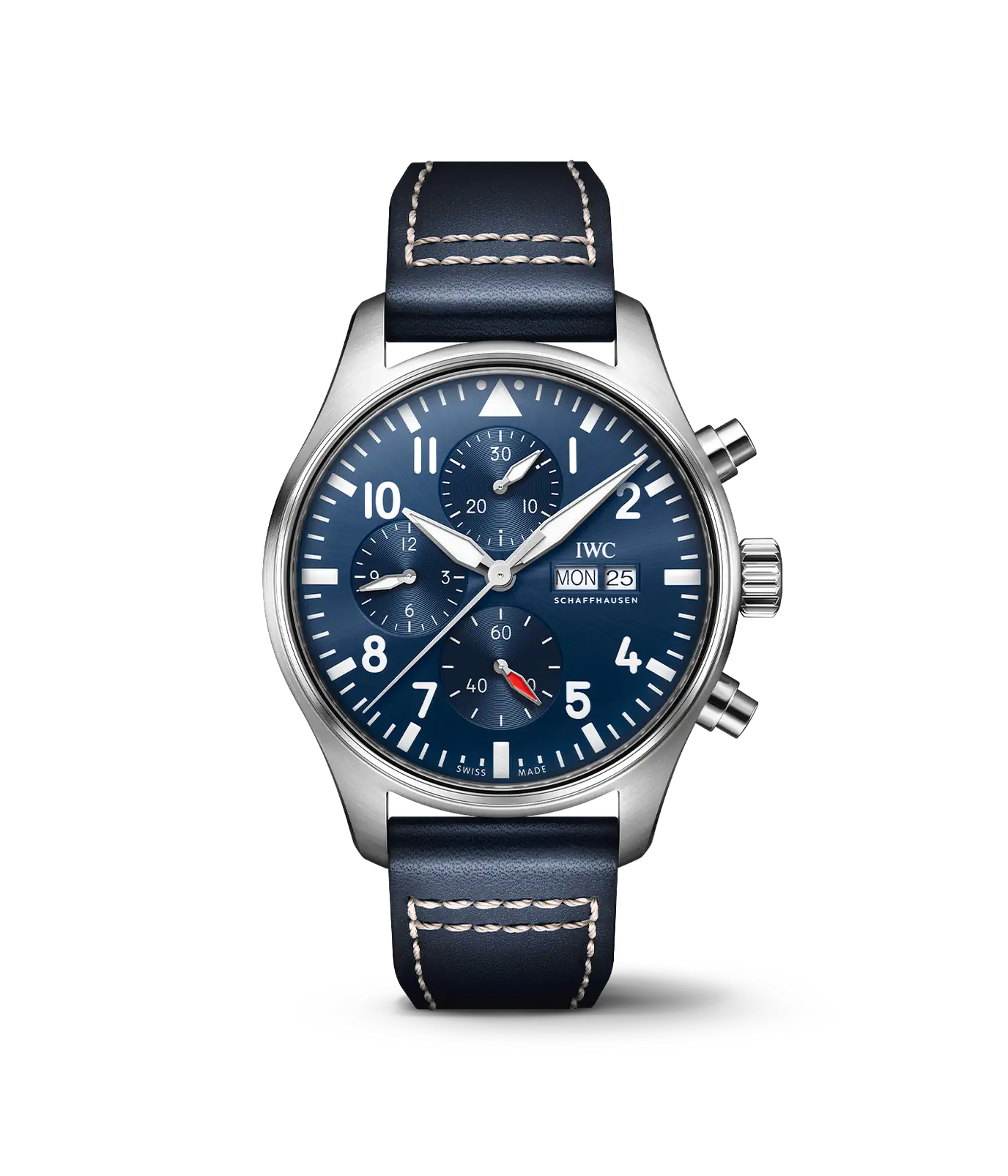 luxury watches IWC Schaffhausen Pilot´s Watches PILOT'S WATCH CHRONOGRAPH Manufacture calibre, 43 mm. The watch has functions luminescence, stopwatch and date . Basic parameters of the watch are: dial colour is blue, movement type is mechanical chronograph with automatic winding, strap material is leather and water resistance is 100 m.