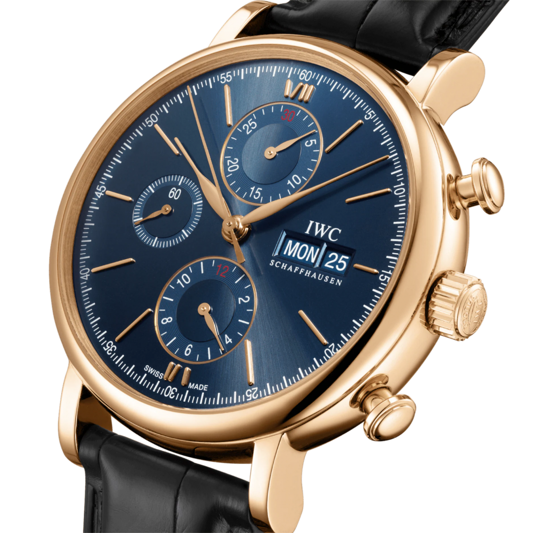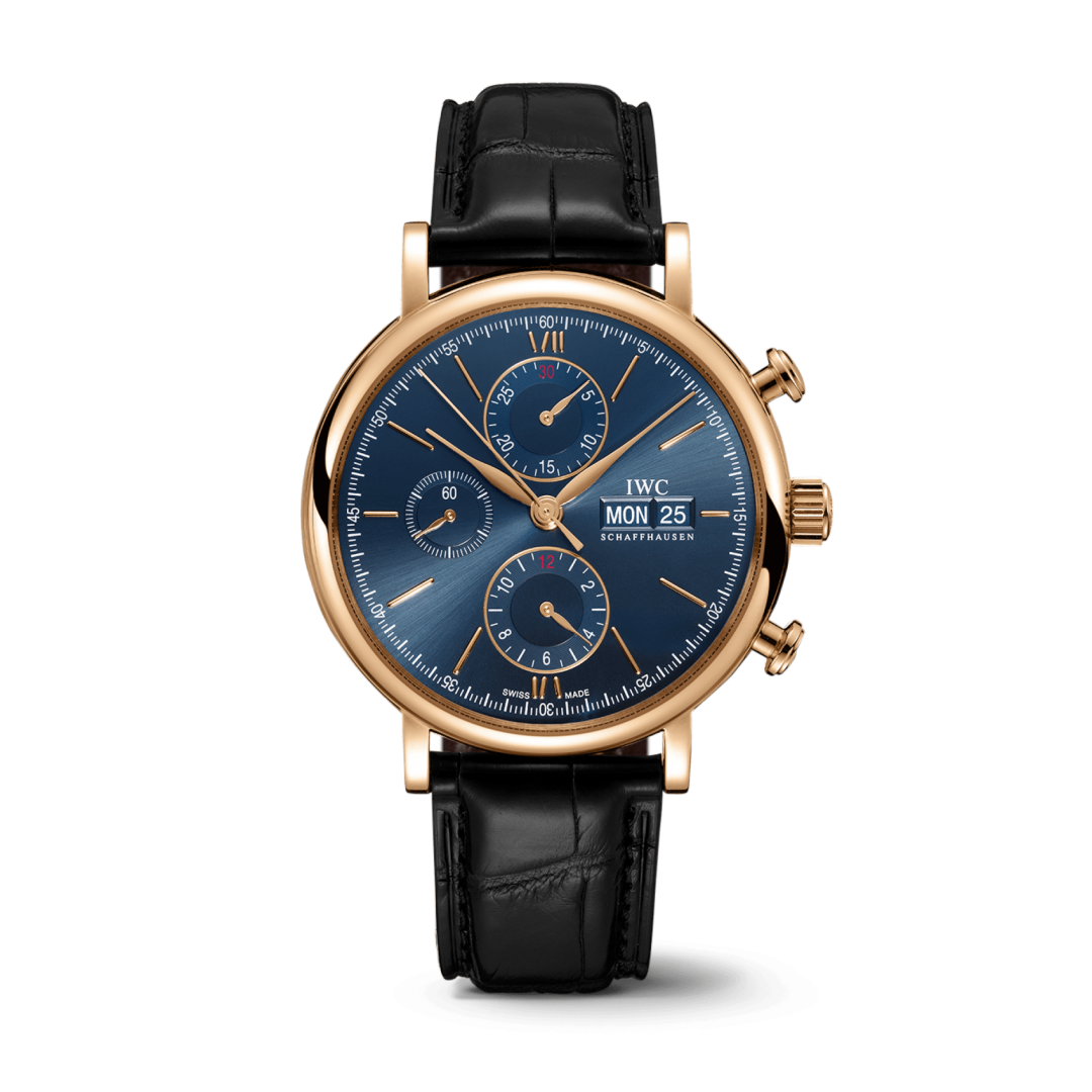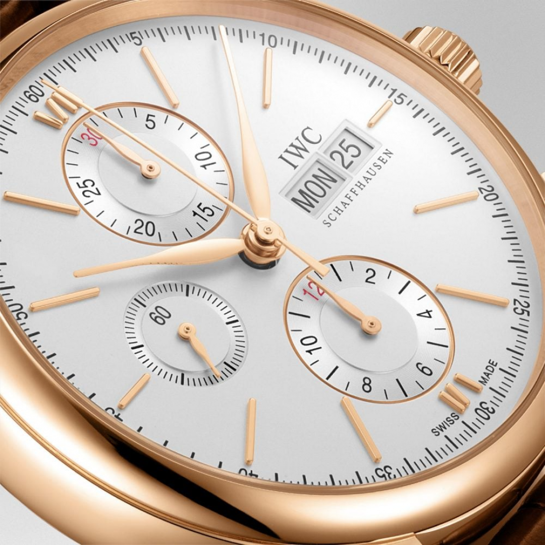 Men's luxury watches IWC Schaffhausen Portofino Chronograph 42mm gold case with leather strap. The watch has functions date, stopwatch and Day-Date. Basic parameters of the watch are: dial colour is white, movement type is mechanical chronograph with automatic winding, bracelet is leather and water resistance is 30 m.