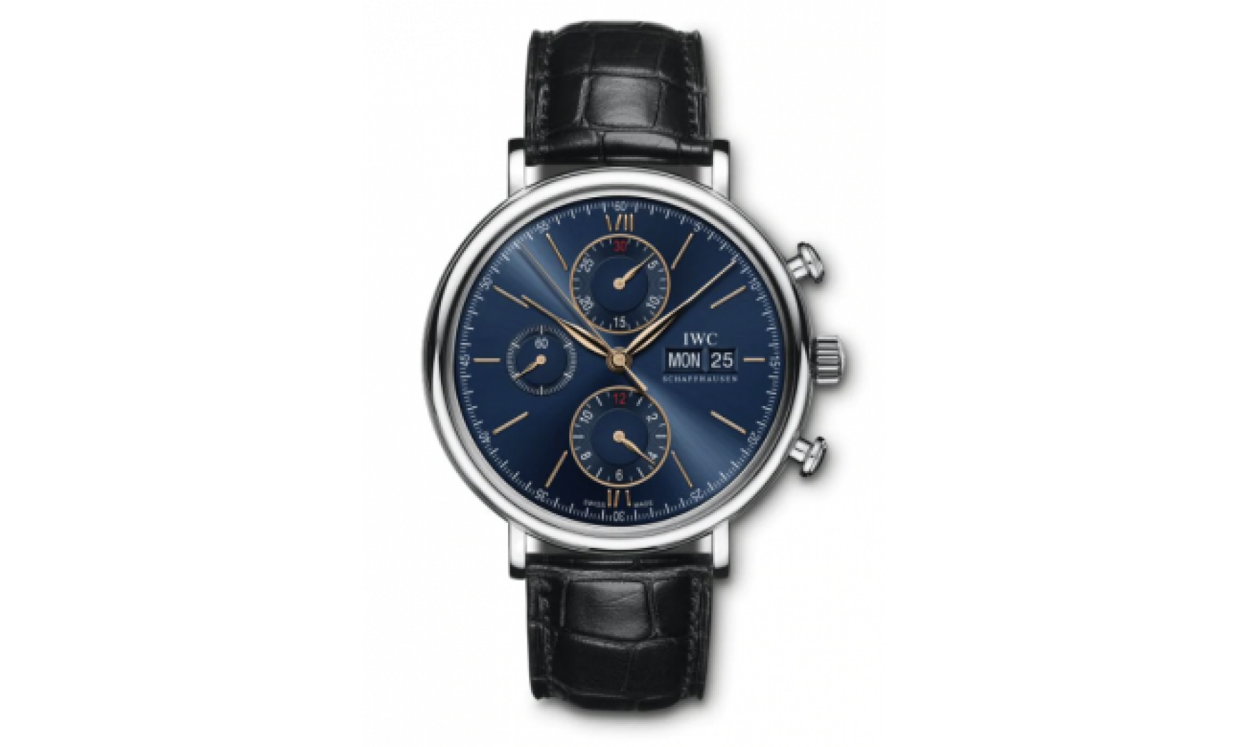 Luxury watches IWC Portofino CHRONOGRAPH 42 mm. The watch has functions stopwatch, date and Day-Date. Basic parameters of the watch are: movement type is mechanical chronograph with automatic winding, strap material is leather, water resistance is 30 m and dial colour is blue.