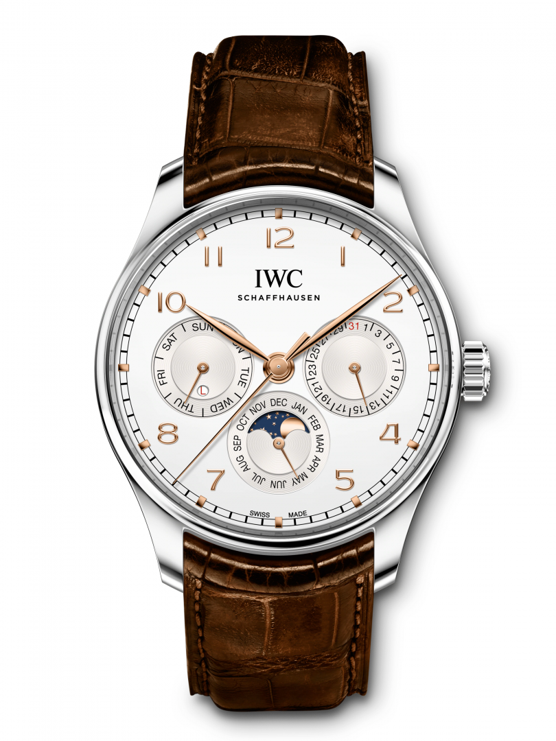 luxury watches IWC Portugieser In-house calibre, Perpetual calendar, 42 mm. The watch has functions date, moon phases, date and perpetual calendar. Basic parameters of the watch are: dial colour is silver, movement type is mechanical watch with automatic winding, strap material is leather and water resistance is 30 m.