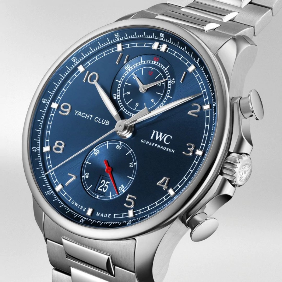 Sport watches swiss watches IWC Portugieser YACHT CLUB CHRONOGRAPH In-House Flyback chronograf, 45.6 mm. The watch has functions stopwatch and date . Basic parameters of the watch are: dial colour is blue, movement type is mechanical chronograph with automatic winding and water resistance is 60 m.