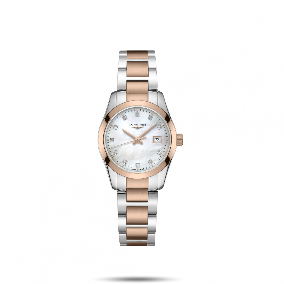 luxury watches Longines Conquest Classic Diamonds, Quartz, 29.50 mm. The watch has functions luminescence and E.O.L.. Basic parameters of the watch are: dial colour is pearl, movement type is Quartz watches, strap material is steel and water resistance is 50 m.