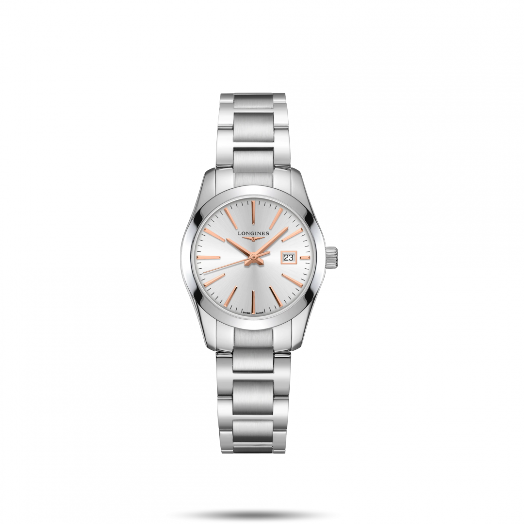 luxury watches Longines Conquest Classic Quartz, 29.50 mm. The watch has functions date and E.O.L.. Basic parameters of the watch are: movement type is Quartz watches, strap material is steel, water resistance is 50 m and dial colour is silver.