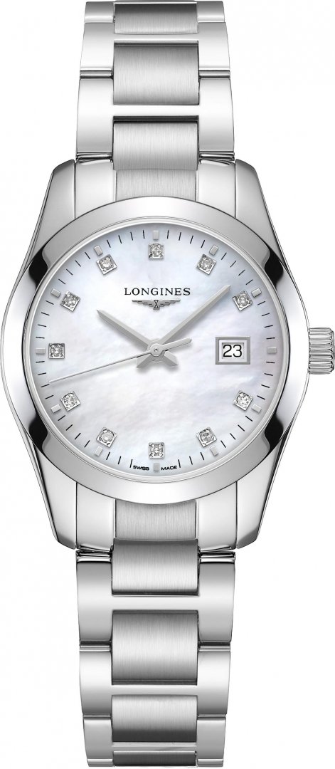Luxury watches Longines Conquest Classic Diamanty, Quartz, 29.50 mm. The watch has functions luminescence and E.O.L.. Basic parameters of the watch are: dial colour is pearl, movement type is Quartz watches, strap material is steel and water resistance is 50 m.