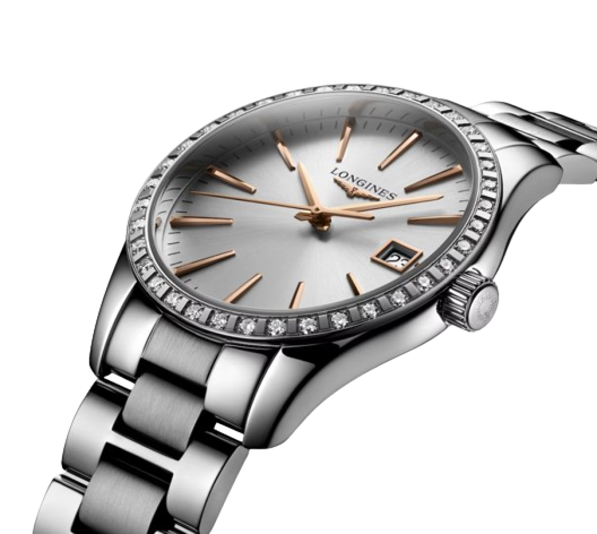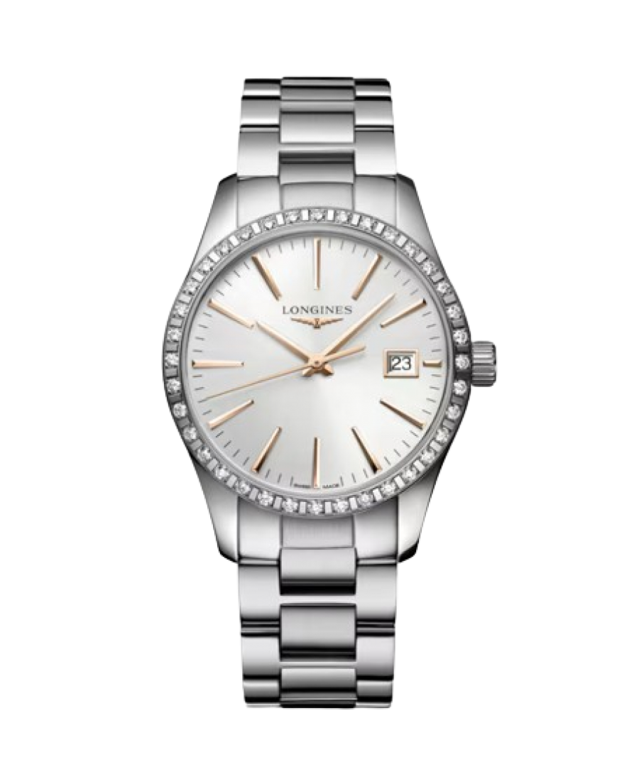 Ladies luxury watches Longines Conquest Classic Women's quartz watch with diamonds bezel 34mm.
