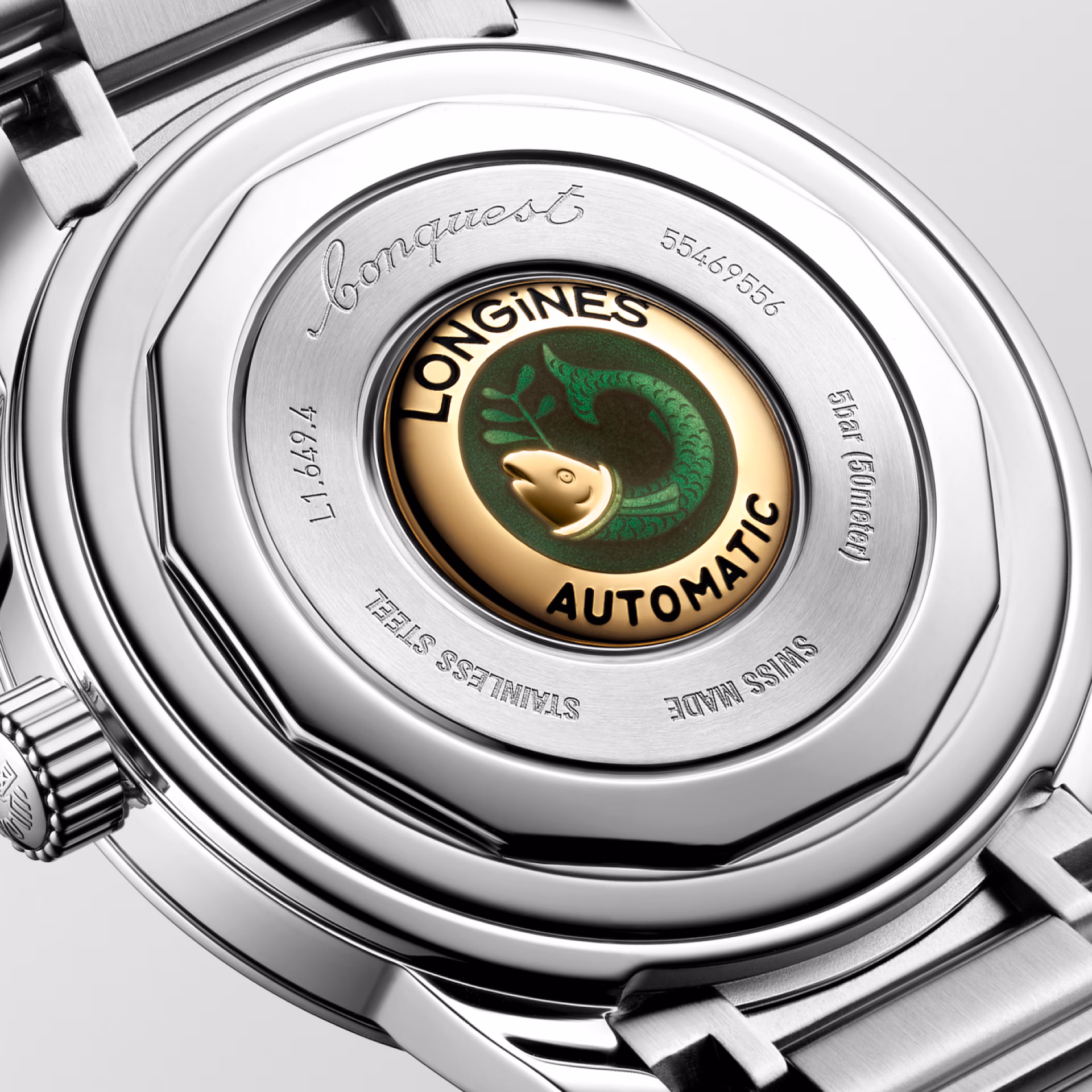 • Case back: 18-carat gold medallion with fish motif – an iconic feature of the original Conquest models