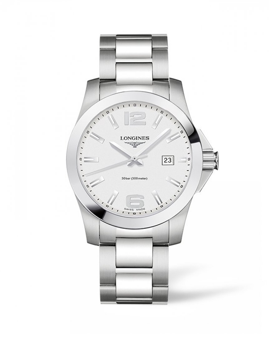 Luxury watches Longines Conquest Water resistance 300M, Quartz, 43 mm. The watch has functions date , luminescence and E.O.L.. Basic parameters of the watch are: strap material is steel, water resistent is 300 m, movement type is Quartz watches and dial colour is silver.