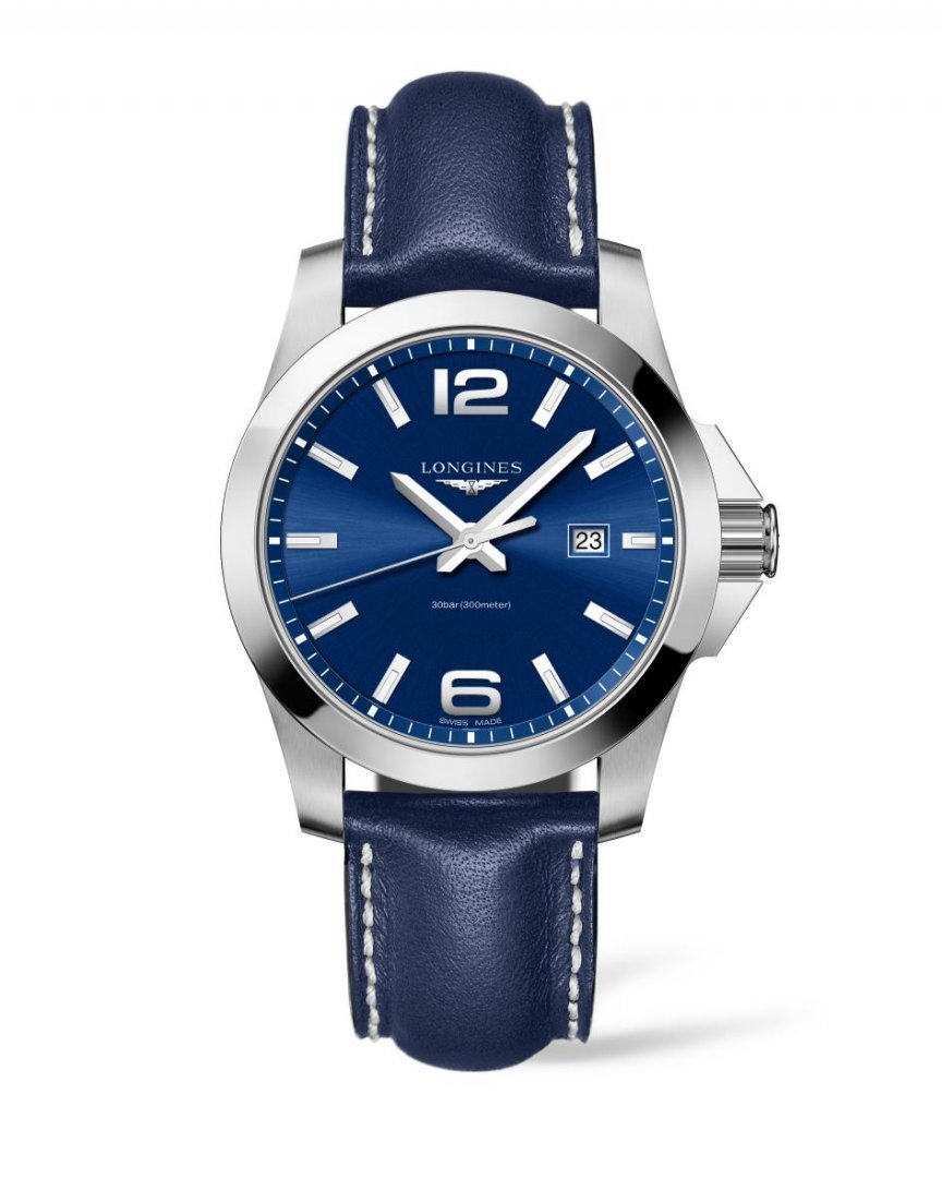luxury watches Longines Conquest Water resistance 300M, Quartz, 43 mm. The watch has functions date , luminescence and E.O.L.. Basic parameters of the watch are: water resistance is 300 m, movement type is Quartz watches, dial colour is blue and strap material is leather.