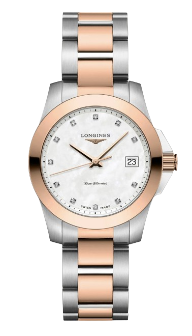 Ladies luxury watches Longines Conquest Women's quartz watch with diamond indexes 34mm.