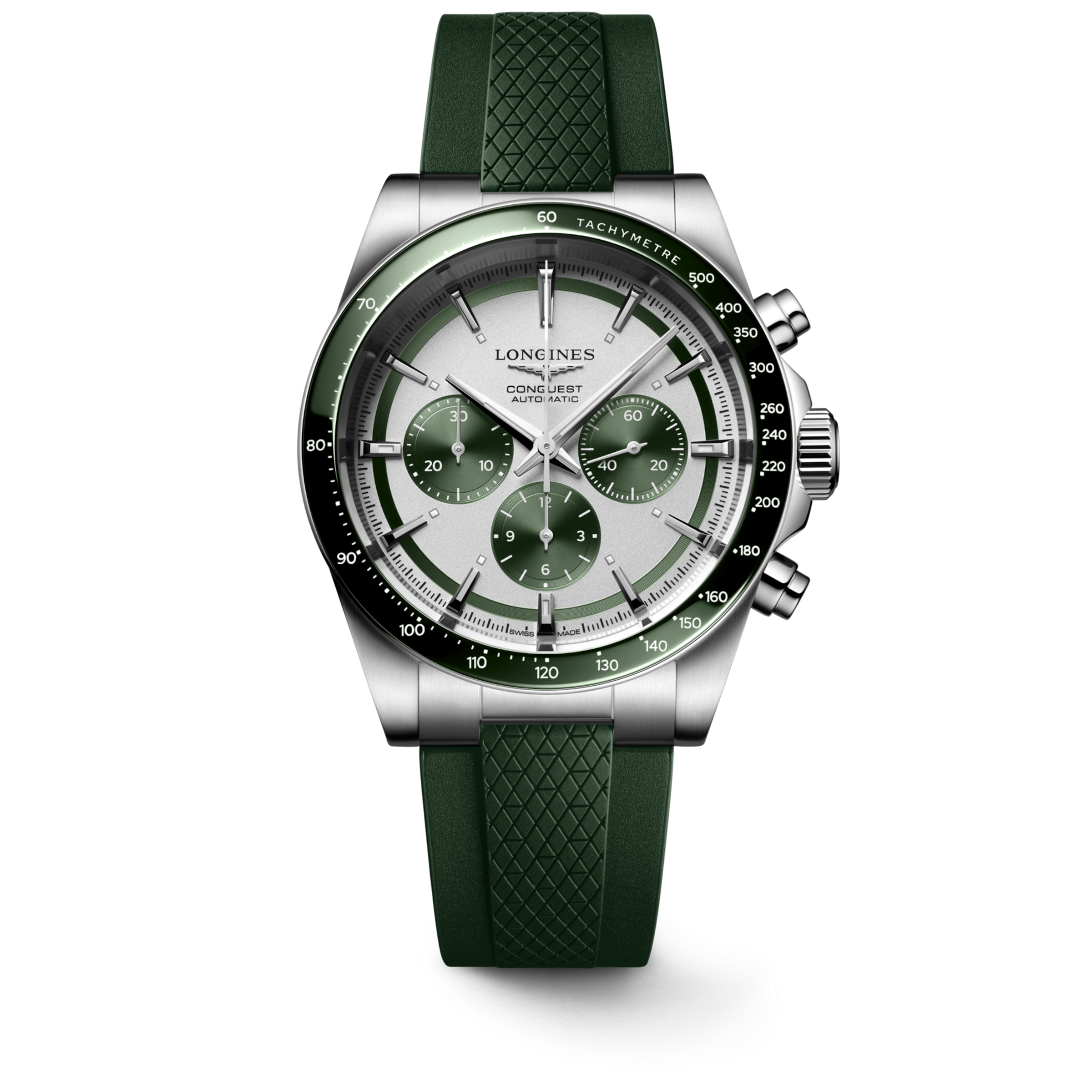 Men's luxury watches Longines Conquest CHRONOGRAPH 42mm steel case with rubber strap. The watch has functions date, stopwatch and E.O.L.. Basic parameters of the watch are: dial colour is silver and green, movement type is mechanical chronograph with automatic winding, water resistance is 100 m and bracelet is rubber.